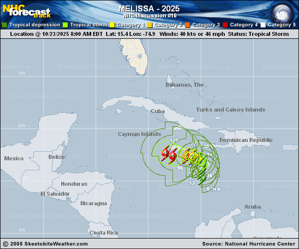 Copy of official data Tropical Storm Melissa Discussion Number 10 NWS National Hurricane Center Miami FL AL132025 500 PM EDT Thu Oct 23 2025 Like the past couple of days, Melissa's structure has degraded once again this afternoon, with the low-level circulation yet again becoming partially exposed on the west side of the deepest convection. This structure is consistent with a tropical cyclone that continues to exhibit significant tilt with height in the downshear direction. A scatterometer pass received after the prior advisory also indicated the center itself remains quite broad with a continued asymmetric wind field and large radius of maximum wind. The initial intensity is being held at 40 kt this advisory, without a substantial change in the subjective or objective intensity aids since the last recon plane left the storm. A NOAA-P3 recon mission will sample the system this evening providing updated detail on the structure and intensity of the storm. Melissa continues to move very slowly, with the initial motion a very slow north-northwest drift at 345/2 kt. The tropical storm's very slow motion over the last day or so is related to it being caught between two mid-level ridges, one located to its southeast over the Lesser Antilles providing northeast steering, and another mid-level ridge building in northwest from Mexico providing southwest steering. Their combined influence is roughly canceling Melissa's overall steering, with a lot of track influences the last couple of nights related to center reformations to the east and north. Interestingly, much of the hurricane-regional model guidance suggests another reformation could occur tonight, and the track guidance envelope has a distinct bend to the northeast in the 12 to 24 hour forecast points. Given the large convective burst ongoing just east of the current broad center, it is feasible it may nudge the short-term track east of due north. After the next day or so, the mid-level ridge currently over Mexico is expected to expand poleward of the storm, and is expected to help turn Melissa to the west. How far north Melissa gets before it turns to the west continues to remain uncertain. One notable change from this morning is that the 12z Google DeepMind ensemble mean (GDMI), which was previously on the northeast side of the track guidance, abruptly shifted to the southwest side of the envelope, now very close to the latest 12z ECWMF forecast. In contrast, both the 12z HAFS-A/B regional hurricane models shifted their tracks further north and east, related to an overnight center reformation. All these shuffling guidance tracks highlight the uncertainty of the overall track forecast, and the latest NHC track was only nudged slightly southward from this morning, blending the reliable HCCA and GDMI aids. This forecast track takes Melissa just south of Jamaica in 60-96 hours, though it is worth noting there are guidance aids that move it near or over Jamaica earlier in the forecast than shown here. Melissa's broad and asymmetric structure argues against much short-term intensification, though the shear that had been plaguing the system is soon expected to decrease. It will likely take at least 24 hours for the storm's tilted structure to become better aligned to take advantage of the other favorable environmental factors (very warm sea-surface temperatures, sufficently moist mid-levels). Regardless, the intensity guidance is insistent on Melissa undergoing a period of rapid intensification in the forecast period, and all 50 members of the Google DeepMind ensemble show the system becoming a major hurricane or stronger. The NHC intensity forecast will follow suit, showing rapid intensification from 36 to 72 h, intensifying Melissa from a tropical storm to a category 4 hurricane in this time period. Remarkably, this is still lower than some of the hurricane-regional models, and is in best agreement with the GDMI intensity forecast, which have plenty of members stronger this the current NHC peak intensity of 125 kt. Over the forecast period, the tropical cyclone is expected to grow in size significantly, and it will likely be a large and dangerous hurricane towards the end of the forecast period. Key Messages: 1. Jamaica: Due to MelissaG��s slow motion, the risk of a prolonged multi-day period of potentially damaging winds, heavy rainfall resulting in life-threatening flash flooding and numerous landslides, and storm surge continues to increase for Jamaica. Preparations to protect life and property should be rushed to completion, since strong winds and flooding rains could begin in Jamaica by Friday or Saturday. 2. Haiti: Heavy rainfall will result in catastrophic flash flooding and landslides across southwestern Haiti by this weekend into early next week. Extensive damage to roads and buildings is expected, potentially isolating communities for an extended period of time. This is a life-threatening situation and immediate preparations to protect life and property should be taken. Strong winds could also potentially last for a day or more over the Tiburon peninsula of Haiti. 3. Remainder of Hispaniola and Eastern Cuba: Heavy rainfall could also produce significant, life-threatening flash flooding and numerous landslides in southern Dominican Republic. Interests in Cuba should monitor the progress of Melissa since the risk of heavy rainfall, damaging winds, and storm surge appears to be increasing. FORECAST POSITIONS AND MAX WINDS INIT 23/2100Z 15.6N 75.5W 40 KT 45 MPH 12H 24/0600Z 15.8N 75.2W 45 KT 50 MPH 24H 24/1800Z 16.0N 75.0W 50 KT 60 MPH 36H 25/0600Z 16.5N 75.1W 60 KT 70 MPH 48H 25/1800Z 16.8N 75.4W 80 KT 90 MPH 60H 26/0600Z 17.1N 76.0W 100 KT 115 MPH 72H 26/1800Z 17.1N 76.7W 115 KT 130 MPH 96H 27/1800Z 17.1N 77.8W 125 KT 145 MPH 120H 28/1800Z 18.0N 78.4W 125 KT 145 MPH $$ Forecaster Papin |