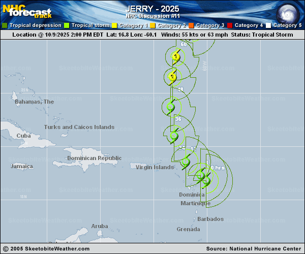 Copy of official data Tropical Storm Jerry Discussion Number 11 NWS National Hurricane Center Miami FL AL102025 1100 PM AST Thu Oct 09 2025 Jerry remains a disheveled tropical storm this evening. Most of the deep convection is displaced to the southeast of the low-level circulation, which continues to run out ahead due to continued northwesterly vertical wind shear. Air Force reconnaissance observations indicate a highly asymmetric wind field, with the peak 850 mb flight level winds of 56 kt in the northeastern quadrant, and very little wind on the western side of the circulation. The flight level winds support lowering the initial intensity to 50 kt this advisory. The surface pressure has been rising as well, with the latest dropsonde data supporting a minimum value of 1005 mb. Jerry appears to finally be moving northwestward now, estimated at 315/15 kt. The track reasoning remains about the same as this afternoon, as Jerry's track should gradually bend more poleward as it moves along the western side of a subtropical ridge. On the forecast track, Jerry is making its closest approach to the Leeward Islands currently, and its asymmetric wind field means that the majority of the stronger winds will stay east of the island chain. Early next week, a faster eastward or east-northeastward motion is forecast in the mid-latitude westerlies. Jerry is expected to pass east of Bermuda in a few days, and given its expected eastward asymmetry, significant impacts still remain unlikely there. The NHC track forecast is quite similar to the prior one, and is a rough blend between the slower and further west HCCA guidance and the faster and further east Google DeepMind Mean (GDMI). The tropical storm is struggling mightily against the unfavorable northwesterly vertical winds shear, and its current poor structure also does not bode well for future short-term intensification. After the storm passes the northern Leeward Islands, the vertical wind shear does decrease to 10-15 knots, but given the current structure, it may take some time for the system to recover. Nonetheless, gradual intensification is shown beginning in 36 hours, though the intensity forecast is lower than the previous advisory. Shear increases towards the end of the forecast and sea-surface temperatures decrease as Jerry recurves into the mid-latitude westerlies, and some weakening is shown again in 120 h. This remains a low confidence intensity forecast, and on the high side of the overall guidance envelope. The most significant hazard expected from Jerry over the next few days is heavy rainfall, even after Jerry passes to the north due to its current structure with most of the significant weather to the south and east of the tropical cyclone. KEY MESSAGES: 1. Tropical storm conditions are expected in the warning area and are possible in the watch area this evening through Friday morning. 2. Heavy rainfall will impact portions of the Leeward Islands, British Virgin Islands, U.S. Virgin Islands, and Puerto Rico through Friday, which could result in flash flooding, particularly in urban areas and in steep terrain. FORECAST POSITIONS AND MAX WINDS INIT 10/0300Z 18.2N 61.6W 50 KT 60 MPH 12H 10/1200Z 19.7N 62.5W 50 KT 60 MPH 24H 11/0000Z 22.1N 63.1W 50 KT 60 MPH 36H 11/1200Z 24.5N 63.1W 55 KT 65 MPH 48H 12/0000Z 27.1N 62.8W 60 KT 70 MPH 60H 12/1200Z 29.5N 62.2W 65 KT 75 MPH 72H 13/0000Z 31.3N 60.5W 65 KT 75 MPH 96H 14/0000Z 31.8N 57.3W 65 KT 75 MPH 120H 15/0000Z 32.5N 51.7W 60 KT 70 MPH $$ Forecaster Papin |