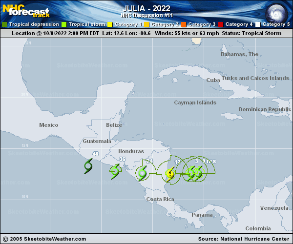 Copy of official data Hurricane Julia Discussion Number 11 NWS National Hurricane Center Miami FL AL132022 1100 PM EDT Sat Oct 08 2022 Reports from NOAA and Air Force Reserve Hurricane Hunter aircraft indicate that Julia became a hurricane near 08/23Z. NOAA measured 700-mb flight-level winds of 73 kt and estimated surface winds of 67 kt on the SFMR, while the Air Force measured 850-mb flight-level winds of 75 kt. The central pressure fell to near 988 mb while the planes were in the cyclone. Based on these data, the initial intensity is set at 65 kt. The initial motion is still westward or 270/14 kt. Strong deep-layer ridging to the north of the hurricane should steer Julia generally westward during the next couple of days with a gradual decrease in forward speed. This motion should bring the center across the coast of Nicaragua during the next several hours, then across Nicaragua on Sunday before emerging into the Pacific late Sunday or Sunday night. After that, Julia, or its remnants, are expected to continue moving generally westward until the system dissipates. The new official forecast track is very similar to the previous track and lies close to the various consensus models. Julia has only a few more hours before landfall in Nicaragua. However, infrared and microwave satellite imagery shows that the convective structure has become much better organized, and the hurricane would likely undergo rapid intensification if it wasn't about to make landfall. While not explicitly shown in the intensity forecast, maximum sustained winds could reach 70-75 kt before landfall. A quick weakening is expected after landfall, but Julia is forecast to be at or near tropical storm strength when it emerges off the Pacific coast of Nicaragua. The intensity forecast still calls for Julia to weaken over the Pacific and dissipate after 48 h as it becomes absorbed by a broader area of low pressure associated with a Gulf of Tehuantepec gap wind event, a scenario supported by the GFS, ECMWF, and Canadian models. However, the UKMET maintains some uncertainty about this, as it shows Julia surviving and movingly slowly westward into the Pacific during the next several days. Regardless of Julia's track and existence as a tropical cyclone, the evolving weather pattern is likely to lead to heavy rains over Central America for several days, which could cause life-threatening flash floods and mudslides, especially in areas of mountainous terrain. Key Messages: 1. Julia is expected to reach the coast of Nicaragua as a hurricane within the next several hours. Hurricane-force winds and a dangerous storm surge will continue in portions of Providencia and San Andres islands during the next few hours, and are expected near the core of the hurricane when it moves onshore in Nicaragua. 2. Life-threatening flash flooding and mudslides are expected across portions of Central America this weekend. Flash flooding is possible across the Isthmus of Tehuantepec in Mexico early next week. 3. Julia is forecast to remain as a tropical storm while it moves across Central America to the adjacent Pacific waters, and tropical storm warnings are in effect along the Pacific coasts of Nicaragua, Honduras, and El Salvador to account for the possibility of tropical-storm-force winds in those areas late Sunday and Sunday night. FORECAST POSITIONS AND MAX WINDS INIT 09/0300Z 12.5N 82.7W 65 KT 75 MPH 12H 09/1200Z 12.5N 84.7W 60 KT 70 MPH...INLAND 24H 10/0000Z 12.6N 87.5W 40 KT 45 MPH...OVER WATER 36H 10/1200Z 13.0N 90.1W 35 KT 40 MPH 48H 11/0000Z 13.4N 92.8W 30 KT 35 MPH 60H 11/1200Z...DISSIPATED $$ Forecaster Beven |