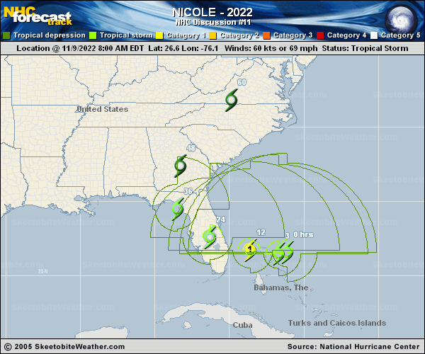 Copy of official data Tropical Storm Nicole Discussion Number 11 NWS National Hurricane Center Miami FL AL172022 400 PM EST Wed Nov 09 2022 The satellite presentation of Nicole has not changed much since late this morning. Curved bands of convection wrap around much of the circulation and there has been a ragged eyewall in radar data from both the Bahamas and Miami. An Air Force Reserve reconnaissance aircraft reported a minimum pressure of 985 mb and peak 850-mb flight-level winds of 72 kt during its final pass through the center and northwestern portion of the storm as Nicole made landfall on Great Abaco Island in the northwestern Bahamas just prior to 1700 UTC. Those aircraft data still supported an intensity of 60 kt, and that remains the initial intensity for this advisory. Recent center fixes show that Nicole is moving westward or 270 degrees at 11 kt. A mid-level ridge located to the north of the cyclone is expected to shift eastward causing Nicole to turn west-northwestward to northwestward tonight. This motion should bring the center onshore the coast of southeastern or east-central Florida overnight, and across the Florida peninsula Thursday morning. As Nicole passes over north Florida late Thursday, a mid-latitude trough moving into the central United States is expected to turn the cyclone or its remnants northward and then northeastward across inland portions of Georgia and the Carolinas. The dynamical model guidance is in good agreement during the first 12 to 24 hours, with some increase in spread during the recurvature portion of the forecast. The updated NHC track forecast is very similar to the previous advisory through 24 hours, but is slightly west thereafter to be close to the latest consensus aids. Nicole still has about 12 hours in which to strengthen. Given the slightly improved inner core structure and the warm waters of the Gulf Stream that Nicole will be traversing, the forecast still calls for the cyclone to reach hurricane status before reaching the east coast of Florida. After landfall, weakening should occur as the center cross the Florida peninsula. Even if the center briefly emerges over the extreme northeastern Gulf of Mexico, re-intensification is not expected. Nicole is forecast to weaken further over the southeastern United Sates, and then dissipate along a frontal zone moving into the eastern United States by 60 hours. Key Messages: 1. Hurricane and tropical storm conditions and a dangerous storm surge are expected to continue over portions of the northwestern Bahamas through this evening, where a Hurricane Warning remains in effect. 2. Hurricane conditions are expected across portions of the coast of southeast and east-central Florida beginning this evening or tonight, where a Hurricane Warning is in effect. Tropical storm conditions will continue along the east coast of Florida, Georgia, and South Carolina within the warning areas into Thursday. Tropical storm conditions are expected to begin along the west coast of Florida within the warning area this evening or tonight. 3. A dangerous storm surge is expected along much of the east coast of Florida, portions of coastal Georgia, and the Florida Big Bend along the Gulf coast. The storm surge will be accompanied by large and damaging waves along the Atlantic coast. Residents in the warning area should listen to advice given by local officials. 4. Do not focus on the exact track of Nicole since it is a large storm with hazards extending well to the north of the center, outside of the forecast cone. These hazards will affect much of the Florida peninsula and portions of the southeast United States. 5. Nicole will produce heavy rainfall today into Thursday across the Florida Peninsula. Flash and urban flooding will be possible across portions of the Florida Peninsula along with renewed river rises on the St. Johns River. Isolated flash, urban, and small stream flooding will also be possible on Friday in the Southeast through the southern and central Appalachians, including the Blue Ridge Mountains, and extending northward through west central Pennsylvania into western New York by Friday night. FORECAST POSITIONS AND MAX WINDS INIT 09/2100Z 26.5N 77.9W 60 KT 70 MPH 12H 10/0600Z 27.3N 80.1W 65 KT 75 MPH 24H 10/1800Z 28.8N 82.8W 45 KT 50 MPH 36H 11/0600Z 31.0N 84.0W 35 KT 40 MPH...INLAND 48H 11/1800Z 34.6N 82.2W 30 KT 35 MPH...POST-TROP/REMNT LOW 60H 12/0600Z...DISSIPATED $$ Forecaster Brown |