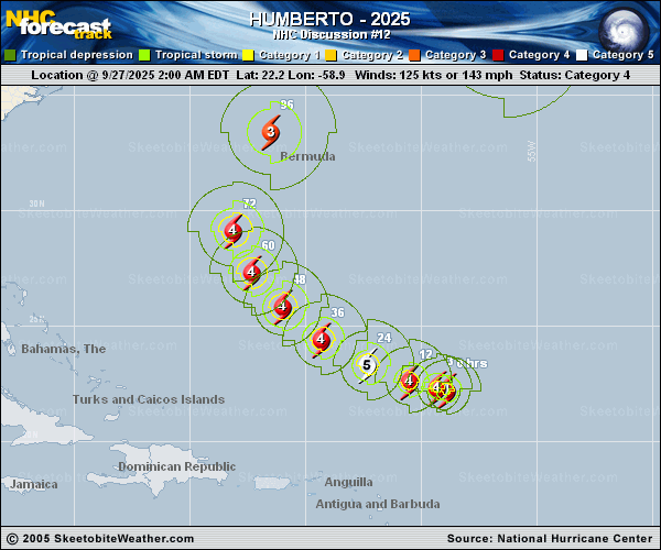 Copy of official data Hurricane Humberto Discussion Number 12 NWS National Hurricane Center Miami FL AL082025 1100 AM AST Sat Sep 27 2025 Since the last advisory, Humberto's eye has once again become better defined and recent WSF-M microwave imagery at 1001 UTC did not indicate the presence of concentric eyewalls. Together, these data suggest Humberto completed its eyewall replacement cycle. Recent objective and subjective intensity estimates range from near 120 kt to just below 130 kt, so the initial intensity remains 125 kt. With the previous eyewall cycle completing, Humberto may resume strengthening today, and this is still indicated in the official forecast. Fluctuations in intensity, up or down, will be possible with with any additional eyewall replacement cycles, and the predictability of the specific timing of such events is quite low, even as the SHIPS secondary eyewall prediction indicates a 2 in 3 chance that another one will occur in the next two days. With the environment otherwise expected to be favorable for strengthening, the NHC forecast continues to show strengthening and maintains Humberto at or above its current strength through the weekend. Next week, Humberto should begin to interact with a mid-latitude trough and undergo a transformation resulting in a significant expansion of its surface wind field and eventual extratropical transition. While Humberto's peak winds should decrease as a result, the spread of its impacts will likely increase as the cyclone grows in size. The hurricane has accelerated a little, with a forward speed now near 7 kt. Humberto will move around the subtropical ridge for the next few days and then accelerate northeastward as it interacts with the aforementioned mid-latitude trough. The official forecast is very similar to the previous one, but with a slightly faster forward speed. The NHC forecast remains closest to a blend of the Google DeepMind and NOAA AIGEFS ensemble means, and the previous official forecast. FORECAST POSITIONS AND MAX WINDS INIT 27/1500Z 22.7N 60.2W 125 KT 145 MPH 12H 28/0000Z 23.1N 61.5W 135 KT 155 MPH 24H 28/1200Z 24.1N 63.4W 135 KT 155 MPH 36H 29/0000Z 25.5N 65.3W 135 KT 155 MPH 48H 29/1200Z 27.1N 66.8W 125 KT 145 MPH 60H 30/0000Z 29.0N 67.9W 120 KT 140 MPH 72H 30/1200Z 31.3N 68.2W 105 KT 120 MPH 96H 01/1200Z 35.4N 64.4W 95 KT 110 MPH 120H 02/1200Z 40.8N 50.3W 85 KT 100 MPH...POST-TROP/EXTRATROP $$ Forecaster D. Zelinsky |