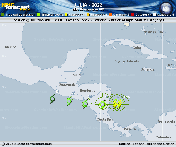 Copy of official data Hurricane Julia Discussion Number 12 NWS National Hurricane Center Miami FL AL132022 500 AM EDT Sun Oct 09 2022 Julia is estimated to have made landfall as a 75-kt hurricane around 0715 UTC along the coast of Nicaragua near Pearl Lagoon. The hurricane appeared to strengthen through landfall, with a more well-defined inner core noted in passive microwave imagery and a center that was embedded deep within the very cold central dense overcast overnight. With the center now located just inland over eastern Nicaragua, the initial intensity is held at 75 kt for this advisory, which is supported by the last ADT estimate from UW-CIMSS (75 kt) and the 06 UTC Dvorak estimate from SAB (77 kt). Julia is moving westward at about 14 kt, and a strong ridge that extends across the southern Gulf of Mexico will continue to steer Julia quickly westward across Nicaragua today. The center of the cyclone is forecast to emerge over the eastern Pacific waters this evening or tonight and then move westward or west-northwestward near the Pacific coast of El Salvador and Guatemala on Monday. There is still above average uncertainty in this part of the forecast. While some models (ECMWF, HWRF, HMON) have trended closer to the coast and even show Julia moving inland, the UKMET lies on the southern edge of the envelope and keeps Julia farther offshore. The GFS is somewhere in the middle, generally showing the vortex skirting the coast. The NHC track forecast has been adjusted to the north of the previous one at 36-48 h, in line with the majority of the models. Land interaction should result in considerable weakening of Julia during the next 12 h or so. However, the fast forward motion is forecast to keep the surface circulation intact, and various models indicate the cyclone will maintain enough organization to remain a tropical storm as it moves off the Pacific coast of Nicaragua later today. The NHC forecast track keeps the center near the coast, where the topography of Central America could further disrupt its low-level structure. The models also indicate that deep-layer easterly shear may increase over the cyclone during the next 24-36 h. Based on these factors, the official NHC forecast shows Julia gradually weakening on Monday and then dissipating on Tuesday. If the track deviates farther north as suggested by some of the models, Julia could move inland and dissipate even sooner than forecast. Regardless of Julia's track and future status as a tropical cyclone, the evolving weather pattern is likely to lead to heavy rains over Central America for several days, which could cause life-threatening flash floods and mudslides, especially in areas of mountainous terrain. Key Messages: 1. Hurricane-force winds and a dangerous storm surge are occurring along portions of the coast of Nicaragua where the core of Julia made landfall this morning. 2. Life-threatening flash flooding and mudslides are expected across portions of Central America Sunday and Monday. Flash flooding is anticipated across the Isthmus of Tehuantepec in Mexico early this week. 3. Julia is forecast to remain as a tropical storm while it moves across Central America to the adjacent Pacific waters, and tropical storm warnings are in effect along the Pacific coasts of Nicaragua, Honduras, and El Salvador to account for the possibility of tropical-storm-force winds in those areas later today through Monday. FORECAST POSITIONS AND MAX WINDS INIT 09/0900Z 12.4N 84.0W 75 KT 85 MPH...INLAND 12H 09/1800Z 12.5N 86.2W 50 KT 60 MPH...INLAND 24H 10/0600Z 12.7N 88.8W 45 KT 50 MPH...OVER WATER 36H 10/1800Z 13.3N 91.4W 40 KT 45 MPH 48H 11/0600Z 14.1N 93.3W 30 KT 35 MPH 60H 11/1800Z...DISSIPATED $$ Forecaster Reinhart |
