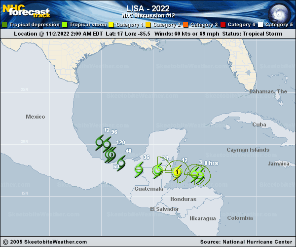 Copy of official data Hurricane Lisa Discussion Number 12 NWS National Hurricane Center Miami FL AL152022 1000 AM CDT Wed Nov 02 2022 Lisa has become better organized on satellite images this morning, with strong convection near the center. Flight-level, SFMR-observed surface wind and Doppler velocity observations from Air Force and NOAA Hurricane Hunter aircraft indicate that the maximum winds are near 70 kt. This is a small hurricane, with the inner-core hurricane-force wind area only about 20 n mi across. The hurricane is likely to make landfall within 12 hours, so it has a small window for additional intensification before the center crosses the coastline. The official forecast shows a 75-kt intensity for the inland point at 12 hours, but it is expected that Lisa will be stronger than that intensity at landfall. The cyclone will rapidly weaken after moving inland and passing over Guatemala and eastern Mexico. Although the center is forecast to emerge over the Bay of Campeche in about 48 hours, strong southwesterly shear associated with an upper-level trough near Texas is expect to cause the system to weaken to a remnant low pressure area by day 5, or sooner. Lisa continues moving westward or around 275/12 kt. Over the next few days, the tropical cyclone should turn toward the northwest and north around the southwestern periphery of a mid-level high pressure area. In 3-5 days, the weak and shallow cyclone is expected to meander slowly over the southwestern Gulf of Mexico within the near-surface flow. The official track forecast is close to the multi-model consensus guidance and is similar to the previous NHC track. Key Messages: 1. There is potential for a life-threatening storm surge near where the center of Lisa crosses the coast of Belize and extreme southeastern portions of the Yucatan Peninsula starting this afternoon. 2. Hurricane conditions are expected along the coast of Belize and the southeastern Yucatan peninsula by this afternoon. 3. Tropical storm conditions are expected along portions of the north coast of Honduras and Guatemala in the next several hours, and over the eastern Yucatan Peninsula in the Tropical Storm Warning areas beginning this afternoon. 4. Localized flash flooding is expected across portions of Belize, northern Guatemala and portions of southeastern Mexico. FORECAST POSITIONS AND MAX WINDS INIT 02/1500Z 17.2N 87.4W 70 KT 80 MPH 12H 03/0000Z 17.3N 88.8W 75 KT 85 MPH...INLAND 24H 03/1200Z 17.5N 90.7W 45 KT 50 MPH...INLAND 36H 04/0000Z 17.8N 92.5W 30 KT 35 MPH...INLAND 48H 04/1200Z 18.6N 94.0W 30 KT 35 MPH...INLAND 60H 05/0000Z 19.6N 95.0W 30 KT 35 MPH...OVER WATER 72H 05/1200Z 20.5N 95.4W 30 KT 35 MPH 96H 06/1200Z 20.0N 94.5W 25 KT 30 MPH 120H 07/1200Z 18.5N 94.0W 20 KT 25 MPH...POST-TROP/REMNT LOW $$ Forecaster Pasch |
