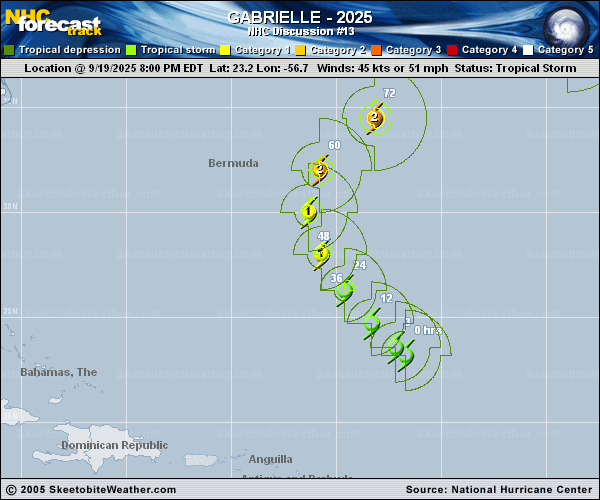 Copy of official data Tropical Storm Gabrielle Discussion Number 13 NWS National Hurricane Center Miami FL AL072025 500 AM AST Sat Sep 20 2025 Although Gabrielle's low-level center is obscured by high cirrus clouds, an 0555 UTC AMSR2 microwave pass confirms that it is still located to the west of the deep convective mass due to continued moderate westerly shear. The convection itself has been quite intense, with a high density of lightning co-located with cloud-top temperatures as cold as -85 to -90 degrees Celsius. The latest satellite intensity estimates, as well as ASCAT data from yesterday evening, still support an intensity of 45 kt. The ASCAT data also showed that there are currently no tropical-storm-force winds on Gabrielle's western side. Mid-tropospheric high pressure over the central Atlantic is steering Gabrielle northwestward, or 315 degrees at 11 kt. The storm is expected to recurve between the western periphery of the high and a trough located over the southeastern United States over the next several days. Mostly because of an adjustment of Gabrielle's initial position, the new NHC track forecast has been adjusted a bit west of the previous prediction during the first 3 days of the forecast. That said, all of the reliable track models continue to keep the core of Gabrielle well east of Bermuda Sunday night and Monday during the recurvature. By Tuesday, global model fields indicate that Gabrielle will become embedded in fast zonal mid-latitude flow, and there has been a significant southward shift in the track models on days 4 and 5. The NHC track forecast has also been adjusted southward at those times, close to the HCCA and Google DeepMind ensemble but not as far south as the GFS and many of the multi-model consensus aids. Vertical shear is expected to decrease over the next day or two, which should allow Gabrielle's circulation to become more vertically aligned, leading to strengthening. The intensity models are generally split into two camps. The statistical-dynamical models (SHIPS and LGEM) and global models (GFS and ECMWF) are more subdued on the amount of strengthening that Gabrielle might experience. The regional hurricane models, as well as the HCCA and Florida State Superensemble, are more aggressive, with the HAFS models in particular bringing Gabrielle to major hurricane strength in about 2 days. While not going that high, the NHC intensity forecast is close to the other models in that camp and continues to show a possible peak of 90 kt in 60-72 hours. With the southward shift in the track forecast at days 4 and 5, Gabrielle's extratropical transition has likely been delayed, and the official forecast continues to depict a tropical cyclone through the next 5 days. KEY MESSAGES: 1. Gabrielle is forecast to become a hurricane by Sunday and pass east of Bermuda Sunday night and Monday. Interests on Bermuda should continue to monitor Gabrielle's forecasts since some wind and rainfall impacts are still possible. 2. Swells generated by Gabrielle are beginning to reach Bermuda and will build through the weekend. These swells are likely to cause life-threatening surf and rip current conditions. FORECAST POSITIONS AND MAX WINDS INIT 20/0900Z 24.3N 58.1W 45 KT 50 MPH 12H 20/1800Z 25.4N 59.3W 50 KT 60 MPH 24H 21/0600Z 27.0N 60.5W 60 KT 70 MPH 36H 21/1800Z 28.6N 61.6W 70 KT 80 MPH 48H 22/0600Z 30.3N 62.1W 80 KT 90 MPH 60H 22/1800Z 32.1N 61.3W 90 KT 105 MPH 72H 23/0600Z 34.0N 59.1W 90 KT 105 MPH 96H 24/0600Z 37.0N 50.6W 80 KT 90 MPH 120H 25/0600Z 38.7N 38.5W 65 KT 75 MPH $$ Forecaster Berg |