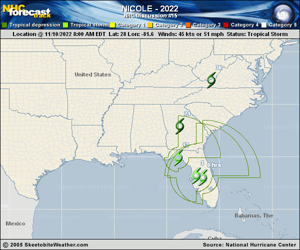 Copy of official data Tropical Storm Nicole Discussion Number 15 NWS National Hurricane Center Miami FL AL172022 400 PM EST Thu Nov 10 2022 The center of Nicole briefly emerged over water north of Tampa around 18Z and is now straddling the coast of the Florida Big Bend region northwest of Cedar Key. An earlier scatterometer overpass showed winds of about 40 kt west of the center over the Gulf of Mexico, and this is the main basis for the initial intensity of 40 kt. Surface observations indicate that the central pressure has risen to near 990 mb. In addition to weakening, the 34-kt wind radii associated with the storm have decreased, particularly in the northeastern quadrant. This has resulted in significant changes to the warnings with this advisory. The initial motion is now 315/13, and this motion is expected to persist through this evening with the center moving into the eastern Florida Panhandle. Subsequently, a low- to mid-level ridge to the northeast of Nicole should move farther eastward as a deep-layer mid-latitude trough and associated surface cold front are approaching from the west. This evolution should cause the storm to turn northward tonight over Georgia, followed by a faster motion toward the north-northeast on Friday. The new forecast track has only minor adjustments from the previous track. Little change in strength is expected until the center moves farther inland tonight. When that happens, Nicole should weaken to a depression over Georgia. On Friday and Friday night, the system is expected to become post-tropical and be absorbed by the large mid-latitude weather system. Key Messages: 1. Tropical storm conditions will continue along portions of the east coast of Florida and Georgia this evening. Tropical storm conditions will spread northward along the west coast of Florida to the coast of the Florida Panhandle through tonight. 2. A storm surge warning is in effect for portions of the northeastern coast of Florida, the southern Georgia coast, and the Florida Big Bend. Residents in the warning area should listen to advice given by local officials. 3. Do not focus on the exact track of Nicole since it is a large storm with hazards extending well to the north of the center, outside of the forecast cone. These hazards will continue to affect much of the Florida peninsula and portions of the southeast United States. 4. Nicole will produce heavy rainfall this evening across the Florida Peninsula. Flash and urban flooding will be possible across portions of the Florida Peninsula along with renewed river flooding on the St. Johns River. Isolated flash, urban, and small stream flooding will also be possible on Friday in the Southeast through the central Appalachians, including the Blue Ridge Mountains, and extending northward through eastern Ohio, west central Pennsylvania, into western New York by Friday night into Saturday. FORECAST POSITIONS AND MAX WINDS INIT 10/2100Z 29.4N 83.2W 40 KT 45 MPH...ALONG THE COAST 12H 11/0600Z 31.2N 84.2W 30 KT 35 MPH...INLAND 24H 11/1800Z 34.9N 82.6W 25 KT 30 MPH...POST-TROP/INLAND 36H 12/0600Z...DISSIPATED $$ Forecaster Beven |