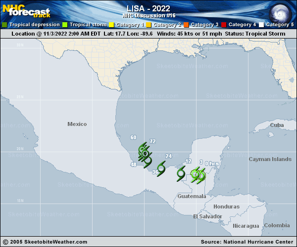 Copy of official data Tropical Depression Lisa Discussion Number 16 NWS National Hurricane Center Miami FL AL152022 1000 AM CDT Thu Nov 03 2022 Lisa has been inland for about 18 hours, and there are no observations of tropical-storm-force winds. Also, using a standard rate of decay over land shows the cyclone weakening below tropical storm intensity by now. Therefore the system is being downgraded to a tropical depression on this advisory. Satellite fixes and observations from the Sabancuy, Mexico, radar indicate that the cyclone continues moving mainly westward and the initial motion estimate is 280/9 kt. Over the next couple of days, Lisa should gradually turn to the northwest and north while moving along the southwestern periphery of a mid-level high. In 2-3 days, the increasingly shallow cyclone is expected to meander over the southwestern Gulf of Mexico within a weak low-level flow. The official track forecast is similar to the previous one and follows the multi-model consensus guidance, TVCA. Lisa is forecast to move over the waters of the Bay of Campeche in 24 hours. Global models show strong southerly to south-southwesterly upper-level winds across most of the Gulf of Mexico during the next few days. The associated strong vertical shear should prevent re-intensification. Global model simulations also show Lisa's mid- to upper-level vorticity maximum being sheared north-northeastward into the northern Gulf while the low-level circulation remains over the Bay of Campeche. The official intensity forecast, like the previous ones, shows the system degenerating into a remnant low in 3 days. Key Messages: 1. Localized flash flooding is expected across portions of southeast Mexico. FORECAST POSITIONS AND MAX WINDS INIT 03/1500Z 18.0N 91.0W 30 KT 35 MPH...INLAND 12H 04/0000Z 18.2N 92.4W 25 KT 30 MPH...INLAND 24H 04/1200Z 18.9N 94.2W 25 KT 30 MPH...OVER WATER 36H 05/0000Z 19.8N 95.1W 25 KT 30 MPH 48H 05/1200Z 20.5N 95.3W 25 KT 30 MPH 60H 06/0000Z 20.2N 95.0W 25 KT 30 MPH 72H 06/1200Z 19.8N 94.9W 20 KT 25 MPH...POST-TROP/REMNT LOW 96H 07/1200Z...DISSIPATED $$ Forecaster Pasch |