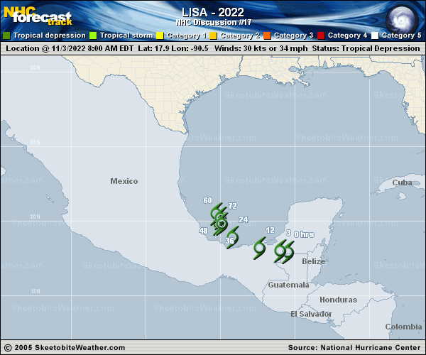 Copy of official data Tropical Depression Lisa Discussion Number 17 NWS National Hurricane Center Miami FL AL152022 400 PM CDT Thu Nov 03 2022 Deep convection associated with Lisa has been diminishing on infrared satellite images, although the system still has nearly a closed ring of precipitation on the Sabancuy, Mexico, radar. Assuming that at least some weakening has occurred during the day, the current intensity estimate is set at 25 kt, which is above the few available surface observations. Center position estimates from visible satellite images and radar indicate that Lisa continues to move generally westward, or at about 280/10 kt. During the next day or two, the cyclone should gradually turn toward the northwest and north while moving along the southwestern and western side of a mid-level high pressure area. Around 48 hours and beyond, the shallow vortex is likely to move slowly and erratically with the near-surface environmental flow. The official track forecast remains close to the dynamical model consensus. Strong south-southwesterly upper-level winds are expected to prevail across most of the Gulf of Mexico over the next few days. Therefore, even though the center of Lisa is forecast to soon move over the waters of the Bay of Campeche, high vertical shear is likely to prevent re-strengthening of the system. The consensus of the numerical intensity guidance calls for weakening through 48 hours, and the official forecast shows Lisa becoming a remnant low in a couple of days. Key Messages: 1. Isolated flash flooding is possible across portions of southeastern Mexico. FORECAST POSITIONS AND MAX WINDS INIT 03/2100Z 18.1N 92.2W 25 KT 30 MPH...INLAND 12H 04/0600Z 18.5N 93.7W 25 KT 30 MPH...OVER WATER 24H 04/1800Z 19.4N 95.0W 25 KT 30 MPH 36H 05/0600Z 20.3N 95.4W 25 KT 30 MPH 48H 05/1800Z 20.7N 95.3W 20 KT 25 MPH...POST-TROP/REMNT LOW 60H 06/0600Z 20.4N 95.1W 20 KT 25 MPH...POST-TROP/REMNT LOW 72H 06/1800Z 20.0N 95.0W 20 KT 25 MPH...POST-TROP/REMNT LOW 96H 07/1800Z...DISSIPATED $$ Forecaster Pasch |