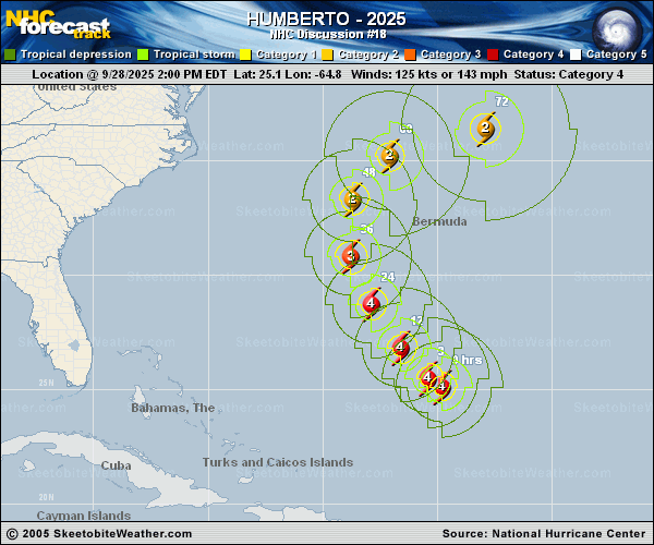 Copy of official data Hurricane Humberto Discussion Number 18 NWS National Hurricane Center Miami FL AL082025 1100 PM AST Sun Sep 28 2025 Humberto remains a powerful category 4 hurricane over the subtropical western Atlantic. The Air Force Hurricane Hunters have been investigating Humberto this evening and found that the major hurricane has concentric eyewalls, with a double wind maximum noted in all quadrants. Based on the flight-level wind data, the initial intensity is set at 120 kt. Dropsonde data from the aircraft suggest that the minimum pressure is quite low at 928 mb. Humberto is moving northwestward at 12 kt in the flow on the south-southwest side of a subtropical high. The major hurricane is expected to gradually turn to the north by late Monday and Tuesday as the high shifts to the east and weakens. After that, a trough is expected to amplify over the north Atlantic, and that should cause Humberto to turn sharply and accelerate east-northeastward Tuesday night and Wednesday. The models are in good agreement, and only minor changes were made to the previous track forecast. While there is high confidence that the core of Humberto will miss Bermuda, there is a possibility of tropical-storm-force winds occurring there late Tuesday and Wednesday in Humberto's outer bands. The intensity of Humberto will likely fluctuate over the next 12 to 24 hours, but gradual weakening is expected after that due to increasing shear and decreasing SSTs. Extratropical transition is now forecast to be complete by 72 hours when the system is expected to merge with the aforementioned mid- to upper-level trough and develop frontal features. The NHC intensity forecast is near the middle of the guidance envelope. The hurricane is expected to grow in size as it gains latitude during the next few days, which will result in a large area of rough seas. See Key Messages below for more information. KEY MESSAGES: 1. Tropical-storm-force winds could begin to affect Bermuda by late Tuesday, and a tropical storm watch is in effect for the island. Interests there should continue to monitor the progress of Humberto. 2. Dangerous marine conditions, including high surf and life-threatening rip currents, are affecting beaches of the northern Caribbean, Bahamas, and Bermuda. The dangerous surf conditions are expected to begin affecting much of the east coast of the U.S. on Monday. FORECAST POSITIONS AND MAX WINDS INIT 29/0300Z 26.2N 66.2W 120 KT 140 MPH 12H 29/1200Z 27.5N 67.3W 120 KT 140 MPH 24H 30/0000Z 29.5N 68.5W 115 KT 130 MPH 36H 30/1200Z 31.9N 68.9W 105 KT 120 MPH 48H 01/0000Z 34.2N 68.0W 95 KT 110 MPH 60H 01/1200Z 35.9N 64.8W 90 KT 105 MPH 72H 02/0000Z 37.3N 58.7W 85 KT 100 MPH...POST-TROP/EXTRATROP 96H 03/0000Z 43.5N 41.5W 75 KT 85 MPH...POST-TROP/EXTRATROP 120H 04/0000Z...DISSIPATED $$ Forecaster Cangialosi |
