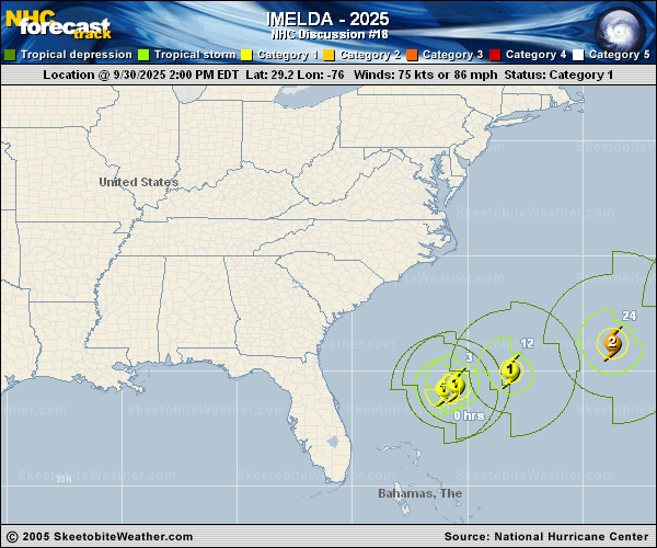 Copy of official data Hurricane Imelda Discussion Number 18 NWS National Hurricane Center Miami FL AL092025 1100 PM EDT Tue Sep 30 2025 Satellite images show that Imelda has developed a ragged large eye feature with deep convection wrapping around its western side. The strongest thunderstorms are currently confined to the northwest quadrant. Despite the structural change, the Air Force Hurricane Hunters have found that the minimum pressure and maximum winds are about the same as earlier. Based on that data, the initial intensity is held at 75 kt. This estimate is notably above the latest satellite estimates. Imelda is starting to pick up some forward speed and continues to bend to the right, with the latest motion estimated to be 070/12 kt. A much faster east-northeast to northeast motion is expected soon in the strong flow ahead of a large-scale trough, in which Humberto is embedded within. This motion should take the core of Imelda near Bermuda Wednesday evening, but weather conditions there will likely begin to deteriorate Wednesday afternoon. After that, a turn to the northeast over the open Atlantic is expected. No significant changes were made to the previous track forecast, and this one lies near the middle of the guidance envelope. Imelda is expected to strengthen overnight and Wednesday as the hurricane approaches Bermuda. The intensification will likely be due to a combination of tropical and non-tropical forcing, and it could become a category 2 hurricane when it is near the island. The models suggest that Imelda will complete extratropical transition in about two days when it merges with a mid- to upper-level trough and the remnants of Humberto. The system is expected to gradually decay after the transition. Imelda is also expected to significantly grow in size over the next few days, which will cause the ongoing high surf and swells to persist over a large portion of the central and western Atlantic. KEY MESSAGES: 1. Imelda is expected to bring damaging hurricane-force winds when it passes near or over Bermuda Wednesday afternoon or evening. A Hurricane Warning is in effect for the island. 2. Imelda is expected to produce heavy rainfall that could cause flash flooding across Bermuda Wednesday into Thursday. Large and damaging waves are also expected on the island. 3. Swells and high surf from both Humberto and Imelda are expected to produce dangerous marine conditions and rip currents along much of the East Coast of the United States during the next several days. FORECAST POSITIONS AND MAX WINDS INIT 01/0300Z 29.7N 73.9W 75 KT 85 MPH 12H 01/1200Z 30.7N 70.9W 85 KT 100 MPH 24H 02/0000Z 32.2N 65.7W 85 KT 100 MPH 36H 02/1200Z 33.9N 60.0W 85 KT 100 MPH 48H 03/0000Z 35.4N 54.4W 80 KT 90 MPH...POST-TROP/EXTRATROP 60H 03/1200Z 37.9N 50.3W 70 KT 80 MPH...POST-TROP/EXTRATROP 72H 04/0000Z 39.9N 48.2W 60 KT 70 MPH...POST-TROP/EXTRATROP 96H 05/0000Z 45.4N 41.2W 50 KT 60 MPH...POST-TROP/EXTRATROP 120H 06/0000Z 51.6N 30.1W 40 KT 45 MPH...POST-TROP/EXTRATROP $$ Forecaster Cangialosi |