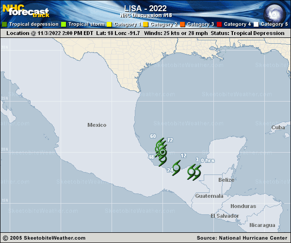 Copy of official data Tropical Depression Lisa Discussion Number 18 NWS National Hurricane Center Miami FL AL152022 1000 PM CDT Thu Nov 03 2022 Satellite imagery, radar data, and surface observations indicate the center of Lisa is still inland over southeastern Mexico. The precipitation associated with the depression has maintained some organization in radar data from Sabancuy tonight. Showers and thunderstorms wrap most of the way around the center, with some fragmented outer bands noted around the northern portion of the circulation offshore of southeastern Mexico. A couple of Pemex buoys in this region have reported sustained winds of 20 kt or so during the past few hours, and the initial intensity of the depression is held at 25 kt for this advisory. Lisa is still moving westward at 275/10 kt. A west-northwestward to northwestward motion is expected on Friday and Friday night as the cyclone moves around a low- to mid-level ridge. Then, the models indicate the shallow vortex will likely stall and meander within the weak low-level environmental flow over the southwestern Gulf. The NHC track forecast is similar to the previous one and remains near the multi-model consensus aids. Although Lisa is forecast to emerge over the warm waters of the Bay of Campeche early Friday, strong south-southwesterly upper-level winds and drier mid-level air should inhibit any significant development. In fact, model-simulated satellite imagery from the GFS and ECMWF show all convection being stripped away from the center during the next 24-48 h by 25-30 kt of deep-layer shear. Therefore, the official intensity forecast keeps Lisa a depression, and it calls for the cyclone to become a remnant low in 48 h and dissipate on Sunday night. Key Messages: 1. Isolated flash flooding is possible across portions of southeastern Mexico. FORECAST POSITIONS AND MAX WINDS INIT 04/0300Z 18.1N 93.1W 25 KT 30 MPH...INLAND 12H 04/1200Z 18.7N 94.4W 30 KT 35 MPH...OVER WATER 24H 05/0000Z 19.6N 95.2W 25 KT 30 MPH 36H 05/1200Z 20.2N 95.3W 25 KT 30 MPH 48H 06/0000Z 20.3N 95.0W 20 KT 25 MPH...POST-TROP/REMNT LOW 60H 06/1200Z 19.8N 95.0W 20 KT 25 MPH...POST-TROP/REMNT LOW 72H 07/0000Z...DISSIPATED $$ Forecaster Reinhart |
