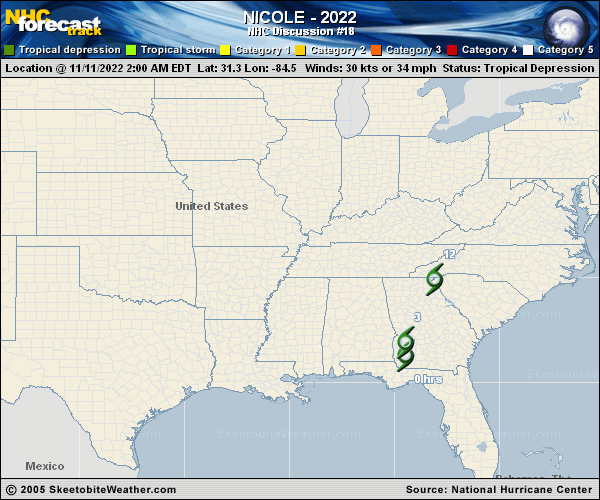 Copy of official data Tropical Depression Nicole Discussion Number 18 NWS National Hurricane Center Miami FL AL172022 1000 AM EST Fri Nov 11 2022 Satellite imagery, NWS radar data, and surface observations across the southeastern U.S. indicate that Nicole still has a well-enough defined circulation and sufficient convective organization to be classified as a tropical depression. Surface observations reveal that its central pressure has risen to near 1001 mb while its strongest sustained winds are near 25 kt. Those winds are occuring just offshore of Georgia and South Carolina. Although Nicole's winds are decreasing, the threat of heavy rain which could lead to flash flooding across portions of the Appalachians will continue today. There is also a threat of tornadoes today, especially well to the northeast of Nicole's center in eastern North Carolina and Virginia. The depression accelerated northward earlier this morning and now appears to be turning north-northeastward as previously forecast. The surface circulation of Nicole will likely become poorly defined and the system will become post-tropical as it continues to accelerate north-northeastward this afternoon and tonight. Since Nicole is a tropical depression with no tropical wind or storm surge watches or warnings, this will be the last advisory issued by the National Hurricane Center. Future advisories will be issued by the Weather Prediction Center. Products from the Weather Prediction Center will continue to populate on the NHC website as long as Nicole remains a flooding threat to the U.S. Key Messages: 1. Renewed river flooding on the St. Johns River (FL) is ongoing. Isolated flash, urban, and small stream flooding will be possible on Friday across the southern and central Appalachians, particularly in the Blue Ridge Mountains. Heavy rain and isolated flooding impacts will extend north through eastern Ohio, west central Pennsylvania, into western New York and northern New England by Friday night into Saturday. FORECAST POSITIONS AND MAX WINDS INIT 11/1500Z 34.2N 84.3W 25 KT 30 MPH 12H 12/0000Z 37.7N 81.1W 25 KT 30 MPH...POST-TROP/INLAND 24H 12/1200Z...DISSIPATED $$ Forecaster D. Zelinsky |