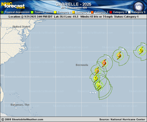 Copy of official data Hurricane Gabrielle Discussion Number 20 NWS National Hurricane Center Miami FL AL072025 1100 PM AST Sun Sep 21 2025 Satellite imagery shows that Gabrielle's core convection has started to wrap up and become a bit more impressive-looking. The latest subjective and objective intensity estimates still range from about 55-68 kt, so the intensity is held at 65 kt for this advisory. Some minor adjustments were made to the wind radii based on a 22/0052 UTC ASCAT-C pass. The motion is estimated to be northwestward, or 325 degrees at 10 kt. A turn to the north-northwest is expected overnight with a northward turn expected on Monday as Gabrielle rounds the western part of the subtropical ridge, and model guidance is in excellent agreement on the first 36 hours of the track forecast. There was a very small westward adjustment to the track forecast, but the latest ASCAT data, which shows that tropical-storm-force winds extend outward no farther than 60 n mi in the western semicircle, strongly indicate that the tropical-storm-force wind field will remain well to the east of Bermuda when Gabrielle makes its closest approach to the island late Monday. Thereafter, the cyclone will accelerate east-northeastward within the mid-latitude westerlies. Mainly minor adjustments were made to the official track forecast, but it should be noted that beyond day 3, there is a large spread in the guidance, and confidence in the track forecast is low at that time range. Gabrielle is expected to strengthen over the next 24 hours, especially given how warm the waters are. However, the amount of strengthening that will occur is uncertain due to moderate westerly wind shear that may affect Gabrielle. For now, the NHC forecast will continue to show rapid intensification over the next 24 hours given the recent improvement noted in the inner-core structure, mentioned above. The NHC forecast during this period is in agreement with a blend of the HAFS/HMON/HWRF/HCCA models. By late Tuesday, steady weakening is expected as wind shear increases, Gabrielle moves into a drier environment, and water temperatures begin to decrease along its path. The intensity forecast from Day 2 onward is a blend of the previous NHC forecast with the latest intensity consensus, which is slightly stronger than the previous NHC prediction. Beyond day 4, there is a very large spread among the models as to Gabrielle's track, intensity, and whether or not it will be starting to attain extratropical characteristics. Therefore, it is too early to predict what, if any, impacts Gabrielle could have on the Azores. KEY MESSAGES: 1. Hurricane Gabrielle is expected to pass east of Bermuda on Monday. While the chances of impacts are still decreasing, interests on Bermuda should continue to monitor forecast updates since some wind and rainfall impacts are still possible. 2. Swells generated by Gabrielle will continue to affect Bermuda during the next few days. These swells are now reaching the east coast of the United States from North Carolina northward, as well as Atlantic Canada, and should continue through early this week. These swells are likely to cause life-threatening surf and rip current conditions. Please consult products from your local weather office. FORECAST POSITIONS AND MAX WINDS INIT 22/0300Z 29.2N 62.2W 65 KT 75 MPH 12H 22/1200Z 30.4N 62.3W 85 KT 100 MPH 24H 23/0000Z 32.0N 61.6W 100 KT 115 MPH 36H 23/1200Z 33.5N 59.5W 95 KT 110 MPH 48H 24/0000Z 34.7N 56.2W 90 KT 105 MPH 60H 24/1200Z 35.5N 51.3W 80 KT 90 MPH 72H 25/0000Z 36.2N 45.6W 75 KT 85 MPH 96H 26/0000Z 39.0N 33.3W 60 KT 70 MPH 120H 27/0000Z 42.7N 23.1W 55 KT 65 MPH $$ Forecaster Hagen |