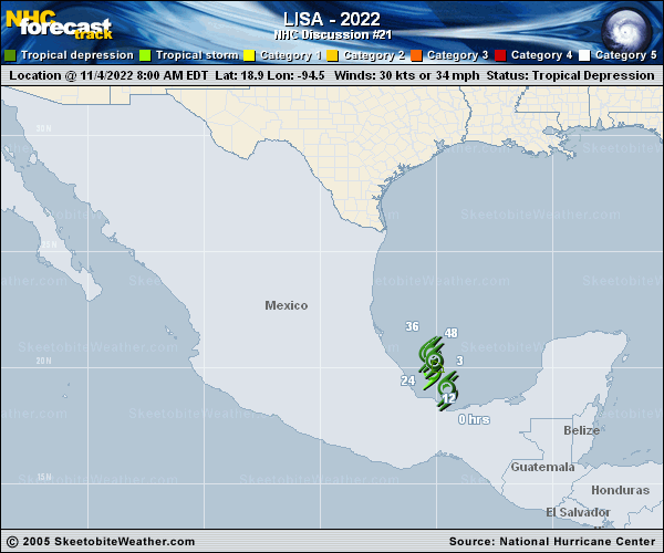 Copy of official data Tropical Depression Lisa Discussion Number 21 NWS National Hurricane Center Miami FL AL152022 400 PM CDT Fri Nov 04 2022 Deep convection that was associated with Lisa this morning has quickly weakened and become displaced well to the northeast of the center due strong south-southwesterly vertical wind shear. Earlier satellite wind data and more recent observations from an Air Force Reserve reconnaissance aircraft indicate that the overnight and morning convective burst did not result in any increase in strength. Data from the aircraft and the scatterometer instrument suggest that Lisa's maximum winds are around 25 kt. Since the shear is forecast to increase further and the mid-level humidity near the cyclone is expected to decrease, additional weakening is anticipated. It is possible that some additional bursts of convection will occur in association with Lisa tonight and early Saturday, but those bursts are not likely to result in a return of organized deep convection. Therefore, Lisa is forecast to become a post-tropical remnant low within 24 hours, but this could occur as early as tonight if convection does not re-develop soon. Lisa was located a bit farther north and west of the previous estimates, which has resulted in an adjustment to the initial position and short-term forecast. Now that Lisa has become vertically shallow it is expected to move slowly northward tonight. It should then stall and begin a southward drift over the weekend before dissipation occurs. The new track forecast is west of the previous track and is a blend of the latest GFS and ECMWF model forecasts. FORECAST POSITIONS AND MAX WINDS INIT 04/2100Z 19.3N 95.3W 25 KT 30 MPH 12H 05/0600Z 20.0N 95.5W 25 KT 30 MPH 24H 05/1800Z 20.6N 95.3W 25 KT 30 MPH...POST-TROP/REMNT LOW 36H 06/0600Z 20.3N 95.2W 20 KT 25 MPH...POST-TROP/REMNT LOW 48H 06/1800Z 19.9N 95.2W 20 KT 25 MPH...POST-TROP/REMNT LOW 60H 07/0600Z...DISSIPATED $$ Forecaster Brown |