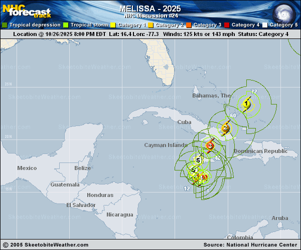 Copy of official data Hurricane Melissa Discussion Number 24 NWS National Hurricane Center Miami FL AL132025 500 AM EDT Mon Oct 27 2025 An ongoing Air Force Reserve Hurricane Hunter aircraft has been measuring progressively higher winds and lower central pressures during each of its passes through Melissa's eye. On the third and final pass, the crew measured a peak flight-level wind of 154 kt and a central pressure of 917 mb. This flight-level wind reduces to about 140 kt, making Melissa a category 5 hurricane. The hurricane's eye is 10 n mi wide with a temperature of 20 degrees Celsius, while the surrounding convection has cloud top temperatures as cold as -86 degrees Celsius. Melissa appears to be gaining some latitude again, but the 12-hour average motion is westward (275 degrees) at 3 kt. A painstakingly slow turn toward the northwest and north is expected during the next 24 hours, and Melissa is forecast to make landfall on the south coast of Jamaica Tuesday morning and emerge off the north coast by Tuesday afternoon. A trough moving across the southeastern United States is then expected to cause Melissa to turn northeastward and accelerate, crossing southeastern Cuba and the southeastern Bahamas Tuesday night and Wednesday, and then reaching the vicinity of Bermuda Thursday night. The part of the forecast track while Melissa is over the western Atlantic has been adjusted a bit westward, following the latest Google DeepMind and European model solutions. Some additional strengthening is possible during the next 12 to 24 hours while Melissa is south of Jamaica over waters of high oceanic heat content and in an environment of relatively low wind shear. Fluctuations in intensity are also possible during this period due to internal dynamics related to eyewall replacements, which are generally difficult to forecast. There's really no practical difference in Melissa making landfall in Jamaica at category 4 or 5 intensity, since both categories can produce catastrophic wind damage. In addition, winds in the mountains of Jamaica are likely to be higher than the winds at sea level, and are likely to add to the seriousness of the situation. Although interaction with Jamaica will lead to some weakening, Melissa is expected to reach southeastern Cuba as a major hurricane, and will also move across the southeastern Bahamas and be near Bermuda as a hurricane. Some of the guidance shows a flatlining of the intensity while Melissa is moving over the southwestern Atlantic, and the NHC forecast has been bumped up during that time accordingly. Key Messages: 1. Jamaica: Do not venture out of your safe shelter. Catastrophic and life-threatening flash flooding and numerous landslides are likely today through Tuesday. Destructive winds, especially in the mountains, will begin by this evening, leading to extensive infrastructural damage, long-lasting power and communication outages, and isolated communities. Life-threatening storm surge and damaging waves are expected along the southern coast through Tuesday. 2. Haiti and the Dominican Republic: Catastrophic and life-threatening flash flooding and landslides are expected across southwestern Haiti and southern portions of the Dominican Republic through midweek. In Haiti, extensive infrastructural damage and isolation of communities is likely. Tropical storm conditions are expected late Tuesday and Wednesday. 3. Eastern Cuba: Heavy rainfall with life-threatening and potentially catastrophic flash flooding and landslides is expected beginning today. Life-threatening storm surge and damaging winds are expected late Tuesday and Tuesday night. Preparations should be rushed to completion. 4. Southeast Bahamas and the Turks and Caicos: Hurricane conditions, life-threatening storm surge, and heavy rainfall are possible on Wednesday. Residents should follow advice given by local officials and be sure to have preparations complete by Tuesday night. FORECAST POSITIONS AND MAX WINDS INIT 27/0900Z 16.4N 77.8W 140 KT 160 MPH 12H 27/1800Z 16.6N 78.1W 145 KT 165 MPH 24H 28/0600Z 17.3N 78.1W 140 KT 160 MPH 36H 28/1800Z 18.5N 77.3W 115 KT 130 MPH...NORTH COAST OF JAMAICA 48H 29/0600Z 20.1N 76.0W 105 KT 120 MPH...OVER SE CUBA 60H 29/1800Z 22.1N 74.4W 90 KT 105 MPH...NEAR SE BAHAMAS 72H 30/0600Z 24.7N 72.3W 85 KT 100 MPH 96H 31/0600Z 32.3N 65.1W 80 KT 90 MPH...NEAR BERMUDA 120H 01/0600Z 41.4N 53.5W 60 KT 70 MPH...POST-TROP/EXTRATROP $$ Forecaster Berg/Hagen |