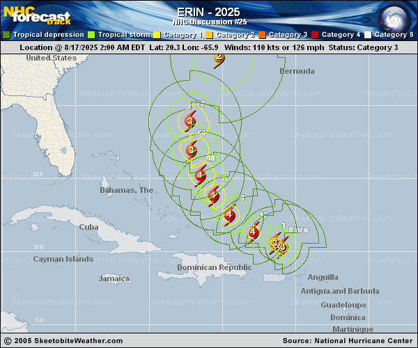 Copy of official data Hurricane Erin Discussion Number 25 NWS National Hurricane Center Miami FL AL052025 1100 AM AST Sun Aug 17 2025 Erin's eye is no longer evident on satellite imagery and observations from the Air Force Hurricane Hunters indicate that the maximum winds are near 110 kt. The central pressure has risen a bit this morning. This slight decrease in intensity is probably due to an eyewall replacement in the inner core as reported by the Hurricane Hunters and is likely a temporary short-term fluctuation. The system remains a well-organized and dangerous major hurricane with a impressively symmetric cloud pattern. Upper-level outflow is strong over all quadrants of the system. Based on fixes from the aircraft, San Juan radar, and satellite images, the hurricane appears to be moving west-northwestward or around 285/11 kt. The track forecast philosophy is about the same as in previous advisories. Over the next couple of days, Erin is expected to turn northward and move between two cells of the mid-tropospheric subtropical high. The track guidance is in good agreement on the northward turn but there are differences in how close the hurricane will come to the U.S. east coast in the 72 hour time frame. The new official forecast has been shifted a little to the west at 3-4 days based on the model consensus. Some additional adjustments to the forecast are possible in future advisories. Erin should remain over very warm waters with moderate vertical wind shear and in a moist low-to mid-level air mass during the next 48-72 hours. Therefore, some renewed increase in strength is expected within the next couple of days. The NHC intensity forecast is in good agreement with the latest corrected consensus model, HCCA, In any event, Erin should remain a dangerous major hurricane through the middle of this week. Erin is growing in size, and that trend is expected to continue over the next few days. The expanding wind field will result in rough ocean conditions over much of the western Atlantic. It should be noted that the 34- and 50-kt wind speed probabilities beyond 36 hours in the text and graphical products are likely underestimating the risk of those winds occurring. This is because the forecast wind field of Erin is considerably larger than average compared to the wind field used to derive the wind speed probability product. KEY MESSAGES: 1. Heavy rainfall will continue into Monday across Puerto Rico, but is expected to diminish over the Virgin Islands later today. Locally considerable flash and urban flooding, along with landslides or mudslides, are possible. 2. Tropical storm conditions are expected in the Turks and Caicos Islands and are possible in the Southeast Bahamas tonight and Monday. Gusts to tropical storm force are possible in Erin's outer rainbands in portions of Puerto Rico today and the central Bahamas on Monday and Tuesday. 3. Erin is expected to produce life-threatening surf and rip currents along the beaches of the Bahamas, much of the east coast of the U.S., Bermuda, and Atlantic Canada during the next several days. 4. Interests along the North Carolina Outer Banks and Bermuda should monitor the progress of Erin as there is a risk of strong winds associated with the outer rainbands during the middle part of the week. FORECAST POSITIONS AND MAX WINDS INIT 17/1500Z 21.0N 67.4W 110 KT 125 MPH 12H 18/0000Z 21.9N 68.8W 115 KT 130 MPH 24H 18/1200Z 23.1N 70.2W 125 KT 145 MPH 36H 19/0000Z 24.4N 71.3W 120 KT 140 MPH 48H 19/1200Z 25.9N 72.2W 115 KT 130 MPH 60H 20/0000Z 27.8N 72.6W 110 KT 125 MPH 72H 20/1200Z 30.0N 72.7W 105 KT 120 MPH 96H 21/1200Z 34.3N 70.4W 95 KT 110 MPH 120H 22/1200Z 39.0N 62.0W 85 KT 100 MPH $$ Forecaster Pasch |