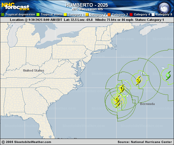 Copy of official data Hurricane Humberto Discussion Number 25 NWS National Hurricane Center Miami FL AL082025 500 PM AST Tue Sep 30 2025 Deep convection has persisted in the northeast quadrant through the day and is now partially obscuring the low-level circulation. An afternoon AMSR2 microwave satellite pass showed curved band wrapping around eastern semicircle of the hurricane. Given the slightly improved satellite presentation and the earlier aircraft data, the initial intensity remains at 70 kt. The wind radii have been updated based on a couple scatterometer passes from 1339 and 1500 UTC. Humberto has turned northward and is moving an estimated 15 kt as the hurricane nears the mid-latitude trough to its north. Later today, the cyclone is expected to turn northeast and on Wednesday to the east-northeast in the westerly flow. Only minor updates have made to the latest NHC track forecast, which lies on the leading edge of the track guidance envelope. Model guidance suggests Humberto should gradually weaken while it merges with the mid- to upper-level trough during the next day or so. Humberto's dissipation has once again been moved up based on recent model trends, now at 36 h. While the official intensity forecast shows Humberto becoming an extratropical cyclone on Wednesday, the European model is showing the potential that it could retain deep organized convection up until the cyclone becomes elongated and loses its closed surface circulation. The hurricane is producing a large area of hazardous marine conditions over the western and central Atlantic, where life-threatening rip currents are expected to affect beaches throughout the region through the week. KEY MESSAGES: 1. Dangerous marine conditions, including high surf and life-threatening rip currents, will continue to affect beaches of the northern Caribbean, Bahamas, Bermuda, and much of the east coast of the United States through the week. FORECAST POSITIONS AND MAX WINDS INIT 30/2100Z 34.0N 69.5W 70 KT 80 MPH 12H 01/0600Z 35.3N 68.3W 65 KT 75 MPH 24H 01/1800Z 36.1N 65.0W 60 KT 70 MPH...POST-TROP/EXTRATROP 36H 02/0600Z...DISSIPATED $$ Forecaster Bucci |