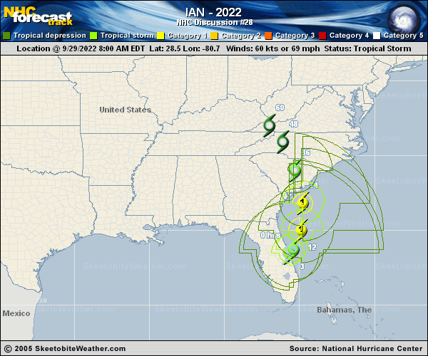 Copy of official data Tropical Storm Ian Discussion Number 28 NWS National Hurricane Center Miami FL AL092022 1100 AM EDT Thu Sep 29 2022 The center of Ian has emerged into the western Atlantic Ocean to the north of Cape Canaveral. While satellite images show the system is becoming a hybrid cyclone, with frontal features outside of the core of Ian, the winds from multiple sources are notable. Velocity data from NWS Doppler radar indicate maximum winds of about 70-75 kt at 10,000 ft over land, and sustained winds of about 55 kt were recorded in the Daytona Beach area earlier this morning. These data support a higher initial intensity, now 60 kt for this advisory. The storm is moving northeastward at about 8 kt. Ian has stubbornly gone east of the track forecast for the past couple of days and has moved back over water faster than expected. A mid-level shortwave trough moving southward across the southern United States should turn Ian northward overnight and north-northwestward on Saturday. The official track forecast is shifted to the east, consistent with the latest consensus guidance. Ian should move over the Gulf Stream tonight and tomorrow for a longer period of time than previously anticipated, which should maintain Ian's central convection. Additionally, an increased pressure gradient on the northwestern side from a stationary front near the southeastern US, should provide a boost to the wind speeds on that side of the storm. We now expect Ian to become a hurricane again by this evening. As the system approaches South Carolina, Ian should maintain this intensity, and Hurricane Warnings have been issued for the entire coast of South Carolina. This scenario is consistent with the global and regional hurricane model guidance. It is worth noting that Ian is forecast to have atypical structure when it nears the southeastern United States, and strong winds will extend well ahead of the center, even on the northwestern side. Key Messages: 1. There is a danger of life-threatening storm surge through Friday along the coasts of northeast Florida, Georgia, and South Carolina. Residents in these areas should follow any advice given by local officials. 2. Hurricane-force winds are expected across the South Carolina coast beginning early Friday, where a Hurricane Warning has been issued. Hurricane conditions are possible by tonight along the coasts of northeastern Florida and Georgia, where a Hurricane Watch is in effect. Preparations should be rushed to completion since tropical-storm-force winds will begin well before the center approaches the coast. 3. Ongoing major-to-record river flooding will continue across portions of central Florida, with considerable flooding in northern Florida. Considerable flash and urban flooding is expected across coastal portions of northeast Florida through Friday. Local significant flooding in southeastern Georgia and eastern South Carolina is expected through the end of the week. FORECAST POSITIONS AND MAX WINDS INIT 29/1500Z 28.7N 80.4W 60 KT 70 MPH 12H 30/0000Z 30.0N 79.9W 65 KT 75 MPH 24H 30/1200Z 31.8N 79.8W 65 KT 75 MPH 36H 01/0000Z 34.0N 80.3W 45 KT 50 MPH...INLAND 48H 01/1200Z 35.9N 81.1W 30 KT 35 MPH...POST-TROP/EXTRATROP 60H 02/0000Z 37.0N 82.0W 15 KT 15 MPH...POST-TROP/EXTRATROP 72H 02/1200Z...DISSIPATED $$ Forecaster Blake |