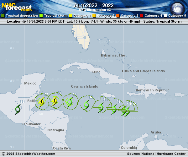Copy of official data Potential Tropical Cyclone Fifteen Discussion Number 3 NWS National Hurricane Center Miami FL AL152022 500 AM EDT Mon Oct 31 2022 The system has changed little in organization overnight. Deep convection is not very extensive at this time and convective banding features are rather limited, as evidenced by a Dvorak classification of T1.0 from TAFB. Thus, the disturbance still lacks sufficient organized convection to be classified as a tropical cyclone. Observations from an Air Force Hurricane Hunter aircraft and scatterometer data indicate that the circulation is somewhat elongated from south to north, and the maximum winds are 30-35 kt. Satellite images show that the broad center is located just to the west of the main area of deep convection. The disturbance continues moving generally westward, or around 270/10 kt. A mid-level anticyclone to the north of the system should maintain a westward to west-northwestward track for the next 48 hours or so. Then, as the high shifts westward, the system is forecast to turn west-southwestward when it nears the coast of Belize or eastern Yucatan. The official track forecast is close to the model consensus and not much different from the previous NHC prediction. It should be noted, however, that the the forecast track could undergo some additional adjustments until the circulation center becomes better defined. It is expected that the system will acquire sufficient convective organization to make the transition to a tropical cyclone in 12 hours or so. During the next couple of days, the system/tropical cyclone will be traversing very warm waters and moving through a fairly moist air mass. Also, the upper-level winds are forecast by the global models to become increasingly anticyclonic which should enhance the outflow over the area. Therefore strengthening appears likely and the official forecast continues to call for hurricane status before landfall in Belize or the eastern Yucatan Peninsula. This is near or above the latest intensity consensus guidance. Key Messages: 1. Tropical storm conditions are possible within the Tropical Storm Watch areas beginning today for Jamaica and on Tuesday for Grand Cayman Island. 2. Interests along the coast of Central America, especially near Belize and the Yucatan Peninsula of Mexico, should monitor the progress of this system. Additional watches and warnings will likely be required early this week. FORECAST POSITIONS AND MAX WINDS INIT 31/0900Z 15.8N 76.1W 35 KT 40 MPH...POTENTIAL TROP CYCLONE 12H 31/1800Z 16.1N 77.5W 40 KT 45 MPH...TROPICAL CYCLONE 24H 01/0600Z 16.4N 79.7W 45 KT 50 MPH 36H 01/1800Z 16.8N 82.2W 50 KT 60 MPH 48H 02/0600Z 17.2N 84.7W 60 KT 70 MPH 60H 02/1800Z 17.4N 86.8W 70 KT 80 MPH 72H 03/0600Z 17.2N 88.6W 70 KT 80 MPH...INLAND 96H 04/0600Z 16.0N 92.0W 30 KT 35 MPH...INLAND 120H 05/0600Z...DISSIPATED $$ Forecaster Pasch |