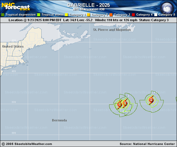 Copy of official data Hurricane Gabrielle Discussion Number 30 NWS National Hurricane Center Miami FL AL072025 500 AM AST Wed Sep 24 2025 Gabrielle continues to slowly weaken. The eye is no longer apparent in conventional satellite imagery, and the outflow continues to be restricted on the western side due to westerly vertical shear. The various subjective and objective satellite intensity estimates are in the 90-105 kt range and have decreased a little during the past 6 h. Based on these, the initial intensity is reduced to a possibly generous 100 kt. The initial motion is now 075/22 kt. For the next three days or so, Gabrielle should continue east-northeastward with some increase in forward speed, with the cyclone moving through or near the Azores in about 48 h. After three days, the cyclone is expected to slow its forward speed and turn southeastward as it is steered by a broad deep-layer trough over western Europe. Since there are only minor changes in the track guidance since the last advisory, the new forecast track is almost identical to the previous track through 72 h, and it is nudged a little south of the previous track after that time. Gabrielle should continue to weaken due to increasing shear and decreasing sea surface temperatures along the forecast track. However, the ECMWF and the GFS are in good agreement that the cyclone should have 75-80 kt winds in the southwestern quadrant as it approaches and moves through the Azores. These forecast winds are likely due to a baroclinic sting jet as Gabrielle interacts with an upper-level trough and undergoes extratropical transition. After that transition is complete in about 60 h, the global models forecast the cyclone to steadily weaken over the northeastern Atlantic. The new intensity forecast has some changes from the previous advisory, with the first 24 h following the intensity consensus and the subsequent forecast periods following a blend of the ECMWF and GFS wind forecasts. KEY MESSAGES: 1. Gabrielle is forecast to approach the Azores late on Thursday as a hurricane. A Hurricane Warning has been issued for all of the islands of the Azores, and hurricane conditions are likely Thursday night and Friday. 2. Swells generated by Gabrielle will continue to affect Bermuda, the east coast of the United States from North Carolina northward and Atlantic Canada during the next couple of days. These swells are likely to cause life-threatening surf and rip current conditions. Please consult products from your local weather office. FORECAST POSITIONS AND MAX WINDS INIT 24/0900Z 35.6N 51.5W 100 KT 115 MPH 12H 24/1800Z 35.9N 47.1W 90 KT 105 MPH 24H 25/0600Z 36.5N 41.0W 80 KT 90 MPH 36H 25/1800Z 37.6N 34.5W 80 KT 90 MPH 48H 26/0600Z 39.1N 28.5W 75 KT 85 MPH 60H 26/1800Z 40.7N 22.9W 65 KT 75 MPH...POST-TROP/EXTRATROP 72H 27/0600Z 41.2N 18.5W 55 KT 65 MPH...POST-TROP/EXTRATROP 96H 28/0600Z 40.3N 12.3W 40 KT 45 MPH...POST-TROP/EXTRATROP 120H 29/0600Z 38.0N 9.0W 25 KT 30 MPH...POST-TROP/EXTRATROP $$ Forecaster Beven |