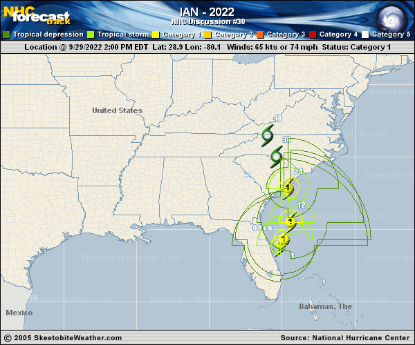 Copy of official data Hurricane Ian Discussion Number 30 NWS National Hurricane Center Miami FL AL092022 1100 PM EDT Thu Sep 29 2022 Ian continues to have the appearance of a hybrid tropical cyclone, having the characteristics of both an extratropical low with some frontal features, and a sheared tropical cyclone with convection well removed from the low-level center. The system is interacting with a mid- to upper-level shortwave trough just to its west, and this interaction may be contributing to slight strengthening. Based on a blend of flight-level and SFMR-observed winds, along with dropsonde measurements, from an Air Force Hurricane Hunter aircraft the current intensity has been increased a little to 70 kt for this advisory. The strongest winds are currently occuring over the northwestern quadrant of the hurricane. Southwesterly vertical wind shear is expected to remain high and the environmental air mass will stay dry until landfall. However, Ian could intensify a little more within the next 12 hours or so due to trough interaction and extraction of energy from the underlying warm Gulf Stream waters. Therefore the NHC forecast calls for slight strengthening before the system reaches the coast. This is above the available intensity model guidance. It should be emphasized that although Ian is not expected to be a classic hurricane at landfall, this does not diminish the threat it poses. Strong winds and storm surge will also extend far from the center and will begin well before the center arrives. Ian continues to move north-northeastward at about 030/9 kt. Over the next day or so, the cyclone is expected to turn northward and then north-northwestward as it moves along the eastern side of the shortwave trough. The dynamical model consensus, TVCN, has again shifted slightly eastward on this cycle. Therefore the NHC track prediction is, again, moved a little eastward from the previous official forecast. Key Messages: 1. There is a danger of life-threatening storm surge through Friday along the coasts of northeast Florida, Georgia, and South Carolina. Residents in these areas should follow any advice given by local officials. 2. Hurricane-force winds are expected across the coasts of South Carolina and southeastern North Carolina beginning early Friday, where a Hurricane Warning is in effect. Hurricane conditions are possible in North Carolina on Friday where a Hurricane Watch is in effect. Preparations should be rushed to completion. 3. Ongoing major to record river flooding will continue through next week across portions of central Florida. Considerable flooding is expected through Friday across portions of coastal and northeast South Carolina. Locally considerable flooding is possible across portions of North Carolina and southern Virginia through Friday. FORECAST POSITIONS AND MAX WINDS INIT 30/0300Z 30.2N 79.3W 70 KT 80 MPH 12H 30/1200Z 31.7N 79.1W 75 KT 85 MPH 24H 01/0000Z 34.0N 79.6W 60 KT 70 MPH...INLAND 36H 01/1200Z 36.0N 80.4W 30 KT 35 MPH...POST-TROP/EXTRATROP 48H 02/0000Z 37.5N 81.0W 20 KT 25 MPH...POST-TROP/EXTRATROP 60H 02/1200Z...DISSIPATED $$ Forecaster Pasch |