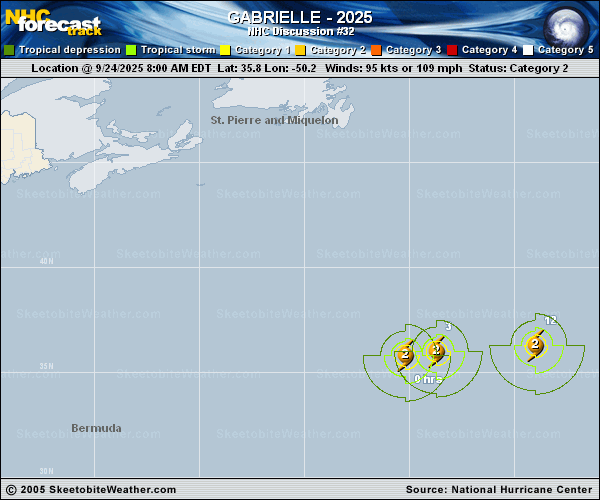 Copy of official data Hurricane Gabrielle Discussion Number 32 NWS National Hurricane Center Miami FL AL072025 500 PM AST Wed Sep 24 2025 The satellite presentation of Gabrielle indicates the hurricane is contending with increasing westerly shear. Recent AMSR2 89 GHz and 37 GHz passive microwave images reveal the vortex is tilted with height, and the western side of the inner core has been eroded. The overall cloud pattern has taken an oblong shape this afternoon. The satellite intensity estimates have gradually decreased today, and the initial intensity is lowered to 85 kt for this advisory. This lies in between the latest UW-CIMSS objective estimates and 18 UTC final-T Dvorak numbers from TAFB and SAB. The hurricane is moving quickly to the east (080/24 kt) within zonal mid-latitude flow. This eastward to east-northeastward motion should continue for the next day or two as Gabrielle passes near or over the Azores late Thursday into early Friday. The track models are tightly clustered for this portion of the forecast, although the guidance consensus is once again faster than the previous cycle. The NHC forecast has been adjusted accordingly. By the weekend, Gabrielle is forecast to slow down and turn toward the east and southeast while passing over the eastern Atlantic. There was an overall northward shift of the guidance envelope from 72-120 h, and this is reflected in the new NHC forecast. As Gabrielle moves over cooler waters within a highly-sheared environment, the hurricane is expected to gradually lose tropical characteristics while interacting with an upper-level trough. The GFS and ECMWF suggest the resulting warm seclusion low structure could lead to the formation of a sting jet feature, with a band of hurricane-force winds wrapping around the back side of the system around the time it moves over the Azores. Since the global models tend to handle these situations well, the NHC forecast closely follows the GFS and ECMWF guidance during this part of the forecast. A Hurricane Warning remains in effect for the Azores, and portions of the islands are likely to experience significant wind and storm surge impacts. Gabrielle should complete its extratropical transition in 36-48 h, and afterwards more significant weakening is forecast as the post-tropical low becomes vertically stacked and fills over the eastern Atlantic. KEY MESSAGES: 1. Gabrielle is forecast to approach the Azores late on Thursday as a hurricane. A Hurricane Warning is in effect for all of the islands of the Azores, and hurricane conditions are likely Thursday night into Friday. Significant hurricane-force wind gusts are likely across portions of the Azores even after the center passes. 2. A dangerous storm surge is expected to produce significant coastal flooding in areas of onshore winds in the Azores. The surge will be accompanied by large and destructive waves. 3. Swells generated by Gabrielle will continue to affect Bermuda during the next couple of days, and the east coast of the United States from North Carolina northward and Atlantic Canada for the next day or so. These swells are likely to cause life-threatening surf and rip current conditions. Please consult products from your local weather office. FORECAST POSITIONS AND MAX WINDS INIT 24/2100Z 36.0N 45.2W 85 KT 100 MPH 12H 25/0600Z 36.4N 40.4W 80 KT 90 MPH 24H 25/1800Z 37.5N 33.8W 80 KT 90 MPH 36H 26/0600Z 39.1N 27.5W 75 KT 85 MPH 48H 26/1800Z 40.5N 22.2W 70 KT 80 MPH...POST-TROP/EXTRATROP 60H 27/0600Z 41.1N 17.0W 60 KT 70 MPH...POST-TROP/EXTRATROP 72H 27/1800Z 40.7N 13.2W 45 KT 50 MPH...POST-TROP/EXTRATROP 96H 28/1800Z 38.0N 7.5W 30 KT 35 MPH...POST-TROP/EXTRATROP 120H 29/1800Z 36.0N 6.5W 25 KT 30 MPH...POST-TROP/EXTRATROP $$ Forecaster Reinhart |