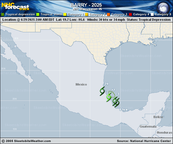 Copy of official data Tropical Storm Barry Discussion Number 5 NWS National Hurricane Center Miami FL AL022025 400 PM CDT Sun Jun 29 2025 Earlier this afternoon, in the final leg exiting Barry in the northeast quadrant, the Air Force Reserve Reconnaissance sampling the storm measured a 850 mb flight level wind of 51 kt at 1647 UTC. This data was the basis for increasing the winds to 40 kt at 18 UTC intermediate advisory using the standard surface wind reduction factor. Since the aircraft left the storm, the satellite presentation has remained quite unimpressive, with the deepest convection near the center being sheared off to the southeast, though a larger curved band is attempting to organize well to the northeast of the small surface vortex. The center has also been trackable on radar based out of Tampico, Mexico. Based partially off the earlier aircraft data, the intensity of Barry remains 40 kt this advisory, but this value is also close to the objective satellite estimates of 41 kt and 40 kt from ADT and SATCON respectively. Barry continues to move off to the northwest, with the latest motion estimated at 315/8 kt, faster than earlier today. The steering flow is well-established by a low-to-mid level ridge parked in the central Gulf, which should maintain Barry's northwestward motion until it makes landfall this evening near Cabo Rojo, between the cities of Tuxpan and Tampico, Mexico. The latest NHC track is only slightly more right than the prior track, and is closest to the interpolated 12 UTC ECMWF track aid this cycle (EMXI). Time is just about up for Barry to intensify more before it makes landfall along the eastern Gulf coast of Mexico. Weakening should begin shortly after the tropical storm moves inland and especially when it encounters the high rugged terrain located in East-Central Mexico. This weakening is reflected in the latest NHC intensity forecast, and Barry will likely dissipate before the end of the day on Monday, in good agreement with the vast majority of the global and hurricane regional model guidance. The primary impact with Barry remains heavy rainfall and flash flooding for the upslope areas of eastern Mexico. Please see the latest forecast rainfall graphic from the Weather Prediction Center International Desk for more information. Key Messages: 1. Tropical Storm Barry will produce heavy rainfall across portions of northeastern Mexico through Monday. Life-threatening flooding and mudslides are possible, particularly in areas of steep terrain. 2. Tropical storm conditions, especially in gusts, are expected later today and tonight over portions of eastern Mexico in the tropical storm warning area. FORECAST POSITIONS AND MAX WINDS INIT 29/2100Z 21.2N 96.9W 40 KT 45 MPH 12H 30/0600Z 22.0N 97.9W 30 KT 35 MPH...INLAND 24H 30/1800Z 22.8N 98.8W 20 KT 25 MPH...POST-TROP/INLAND 36H 01/0600Z...DISSIPATED $$ Forecaster Papin |