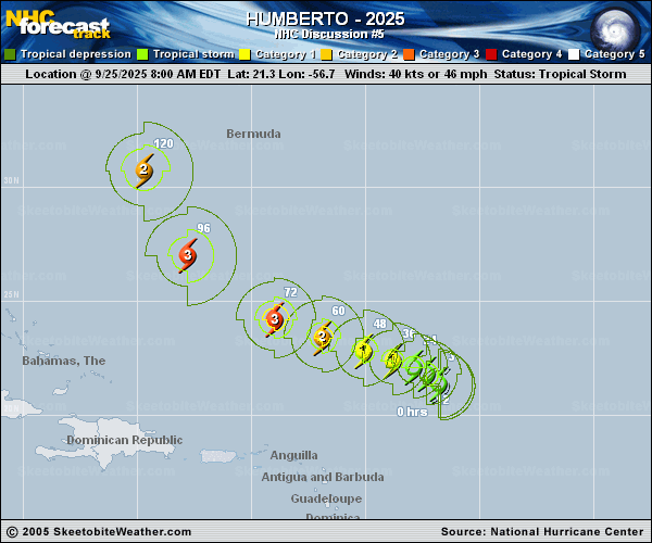 Copy of official data Tropical Storm Humberto Discussion Number 5 NWS National Hurricane Center Miami FL AL082025 500 PM AST Thu Sep 25 2025 Humberto continues to gradually gain strength over the central Atlantic. Deep convection has been increasing over the center, and the cloud pattern is more symmetric than it was earlier today. This is an indication that the wind shear around the storm is lessening. Recent microwave images indicate that an inner core appears to be forming, and an earlier ASCAT pass showed maximum winds of about 45 kt. Based on the improving satellite presentation, the initial intensity is increased to 50 kt. This value is also near the average of the latest satellite intensity estimates. The 34-kt wind radii have been adjusted based on the ASCAT data. Steady to rapid strengthening is expected during the next few days as the storm moves into a more favorable environment of light winds aloft and high moisture. Given that Humberto is relatively compact and an increasingly symmetric system, these conditions should cause it to become a hurricane on Friday and a major hurricane over the weekend. Less favorable environmental conditions should cause some weakening early next week. This prediction remains in line with the latest HCCA and IVCN consensus models. The storm has jogged a little to the north today, but the overall motion is northwestward at 5 kt. Humberto remains embedded in weak steering currents on the south side of a narrow and weak subtropical high over the central Atlantic. This pattern should keep the storm moving slowly to the west-northwest or northwest during the next day or two. After that time, Humberto is expected to become increasingly steered by a much stronger high over the western Atlantic, which should cause the storm to accelerate. The NHC track forecast is a little slower than the previous one, trending toward the latest consensus and Google Deep Mind models. This forecast keeps Humberto over the open central and western subtropical Atlantic during the next several days. FORECAST POSITIONS AND MAX WINDS INIT 25/2100Z 21.9N 57.0W 50 KT 60 MPH 12H 26/0600Z 22.3N 57.4W 60 KT 70 MPH 24H 26/1800Z 22.5N 58.0W 70 KT 80 MPH 36H 27/0600Z 22.7N 59.1W 80 KT 90 MPH 48H 27/1800Z 23.0N 60.8W 90 KT 105 MPH 60H 28/0600Z 23.6N 62.7W 100 KT 115 MPH 72H 28/1800Z 24.6N 64.7W 105 KT 120 MPH 96H 29/1800Z 28.0N 68.2W 105 KT 120 MPH 120H 30/1800Z 31.6N 69.9W 90 KT 105 MPH $$ Forecaster Cangialosi |