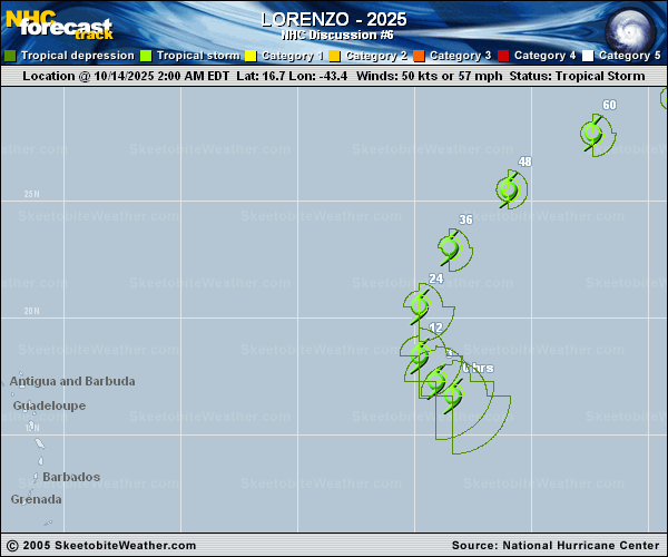 Copy of official data Tropical Storm Lorenzo Discussion Number 6 NWS National Hurricane Center Miami FL AL122025 1100 AM AST Tue Oct 14 2025 Lorenzo remains a poorly organized storm over the tropical central Atlantic. The system is producing a few clusters of deep convection, one of which is currently over the low-level center. The satellite intensity estimates have come down and now range from 30 to 39 kt. In addition, very recent ASCAT passes show peak winds of about 35 kt. Based on these data, the initial intensity is lowered to 40 kt. Lorenzo continues to move northwestward at 13 kt. A turn to the north is expected later today as the storm moves into a weakness in the subtropical ridge. On Wednesday, the storm is likely to turn northeastward when it moves in the flow between an approaching mid-to upper-level trough and the subtropical ridge over the eastern Atlantic. If the storm survives, the system could turn eastward or southeastward this weekend on the northern periphery of the ridge. The track guidance is in fair agreement, and no big changes were made to the previous prediction. The storm is currently embedded in a sheared and dry environment, and those conditions are expected to persist during the next several days. The model guidance shows little to no strengthening. In fact, most of the global models show Lorenzo remaining lopsided, and then opening up into a trough within the next few days. Based on a combination of the models and the lower initial intensity, the NHC intensity forecast has again been nudged downward, and now shows dissipation occurring by day 4. FORECAST POSITIONS AND MAX WINDS INIT 14/1500Z 18.2N 44.9W 40 KT 45 MPH 12H 15/0000Z 19.6N 45.4W 40 KT 45 MPH 24H 15/1200Z 22.0N 44.8W 40 KT 45 MPH 36H 16/0000Z 24.7N 42.5W 40 KT 45 MPH 48H 16/1200Z 27.3N 39.2W 40 KT 45 MPH 60H 17/0000Z 29.4N 35.5W 35 KT 40 MPH 72H 17/1200Z 29.9N 32.7W 35 KT 40 MPH 96H 18/1200Z...DISSIPATED $$ Forecaster Cangialosi |