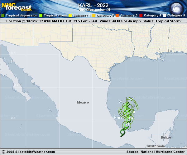Copy of official data Tropical Storm Karl Discussion Number 6 NWS National Hurricane Center Miami FL AL142022 400 PM CDT Wed Oct 12 2022 The overall satellite presentation of Karl has improved since early this morning, but the system is being affected by moderate westerly shear. The center is located near the western edge of a persistent cluster of convection that has cloud top temperatures of around -80C. As mentioned in the earlier Special Advisory, an Air Force Reserve reconnaissance aircraft measured a peak 850-mb flight level wind of 58 kt and SFMR winds of around 50 kt as it exited the eastern portion of the storm. There has been little overall change in structure since the plane departed, so the initial intensity is held at 50 kt. Another reconnaissance mission into the storm is scheduled for this evening. Karl has continued to move northward, but its poleward progress is forecast to end very soon. A ridge building over northern Mexico is forecast to start steering the cyclone generally southward later tonight or early Thursday. A southward motion should then continue, and this motion is expected to bring the center near the southern coast of Bay of Campeche on Friday. The 1200 UTC dynamical model guidance suite is in slightly better agreement, but it was once again east of the previous NHC advisory. Another fairly significant eastward shift was required, but the latest forecast is now closer to the consensus aids as well as a blend of the GFS and ECMWF models. Karl is located over warm water but within an area of moderate westerly wind shear. The shear is forecast to increase slightly, however some additional slight strengthening is possible in the short term. After that, the shear and slightly lower mid-level humidity is expected to cause gradual weakening before Karl reaches the coast of Mexico. After landfall, rapid weakening and dissipation should occur. The NHC wind speed forecast is slightly higher than before, and it is not much different than the latest ICON and HCCA consensus aids. Key Messages: 1. Heavy rainfall could produce instances of flash flooding, with mudslides in areas of higher terrain, across portions of Veracruz and Tabasco states in Mexico. 2. Tropical storm conditions are possible in the watch area in Mexico beginning on Friday. FORECAST POSITIONS AND MAX WINDS INIT 12/2100Z 22.2N 94.4W 50 KT 60 MPH 12H 13/0600Z 22.2N 94.3W 55 KT 65 MPH 24H 13/1800Z 21.4N 94.0W 50 KT 60 MPH 36H 14/0600Z 20.5N 93.8W 50 KT 60 MPH 48H 14/1800Z 19.5N 93.8W 45 KT 50 MPH 60H 15/0600Z 18.7N 94.0W 40 KT 45 MPH 72H 15/1800Z 17.5N 94.7W 25 KT 30 MPH...POST-TROP/REMNT LOW 96H 16/1800Z...DISSIPATED $$ Forecaster Brown |