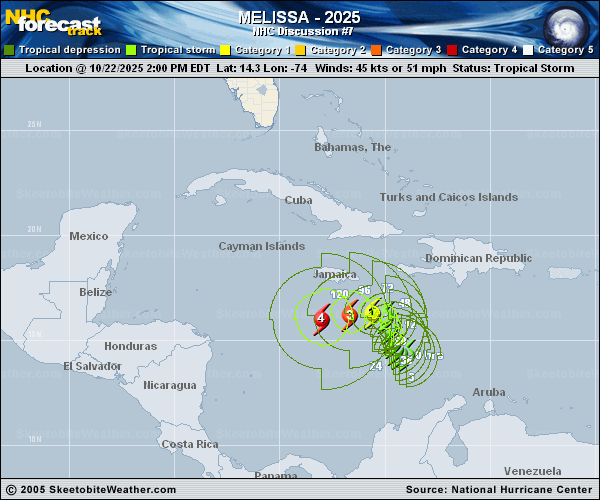 Copy of official data Tropical Storm Melissa Discussion Number 7 NWS National Hurricane Center Miami FL AL132025 1100 PM EDT Wed Oct 22 2025 Air Force and NOAA Hurricane Hunter aircraft observations and satellite imagery indicate that Melissa remains a sheared tropical cyclone, With The low-level center of the storm situated to the west and northwest of the main areas of thunderstorms. The convection continue to be very deep with cloud tops to -80 deg C or colder. There is some evidence of a convective banding feature over the southern portion of the circulation, but the overall cloud pattern is not well organized. Upper-level outflow continues to be restricted to the west of the storm due to the west-northwesterly shear. Tail Doppler data from the NOAA aircraft show a significant eastward tilt of the vortex with height. Observations from the Hurricane Hunters indicate that the central pressure is not falling at this time, and that the maximum winds remain near 45 kt. This is also supported by objective satellite-derived intensity estimates from UW-CIMSS. Center fixes from the aircraft show that Melissa is still moving very slowly, at around 270/2 kt. In the short term, the cyclone is expected to turn northwestward to northward in a weakness in the mid-level ridge. In 48 hours or so, a weak ridge is expected to build to the north of Melissa which should induce a westward turn. Around the end of the forecast period, the ridge is expected to weaken and the system is predicted to turn to the right. The official track forecast is very similar to the previous one and lies between the latest HCCA corrected consensus and the simple dynamical model consensus. This is somewhat west of the latest Google DeepMind ensemble mean forecast. There continues to be a large spread in the guidance models, indicating less than normal confidence in the track forecast, especially around day 5. Melissa is likely to continue to be influenced by significant westerly vertical wind shear during the next day or two, so only slow strengthening is forecast during the next 48 hours. Later in the forecast period, the global models show a relaxation of the shear. This, along with the very high oceanic heat content over the area, could result in significant strengthening. The official intensity forecast is similar to the previous one, and very close to the HCCA and FSU Superensemble guidance. Key Messages: 1. Melissa is forecast to meander over the central Caribbean Sea and could potentially become a major hurricane by late this weekend or early next week. Interests in Jamaica, Haiti, Cuba, and the Dominican Republic are urged to continue monitoring the latest forecasts. 2. Due to MelissaG��s slow motion, the risk of a prolonged period of strong winds, possibly lasting for a day or more, is increasing for Jamaica and the Tiburon peninsula of Haiti. Preparations to protect life and property should be rushed to completion, since strong winds could begin in these areas as early as late Thursday or Friday and continue increasing over the weekend. 3. Melissa is expected to produce heavy rainfall across portions of the Dominican Republic, Haiti, and Jamaica through this weekend, bringing a risk of significant, life-threatening flash flooding and numerous landslides. FORECAST POSITIONS AND MAX WINDS INIT 23/0300Z 14.3N 74.6W 45 KT 50 MPH 12H 23/1200Z 14.7N 74.9W 45 KT 50 MPH 24H 24/0000Z 15.0N 75.1W 50 KT 60 MPH 36H 24/1200Z 15.3N 75.2W 50 KT 60 MPH 48H 25/0000Z 15.7N 75.3W 55 KT 65 MPH 60H 25/1200Z 16.0N 75.6W 65 KT 75 MPH 72H 26/0000Z 16.1N 76.2W 75 KT 85 MPH 96H 27/0000Z 16.0N 77.5W 100 KT 115 MPH 120H 28/0000Z 16.5N 78.5W 115 KT 130 MPH $$ Forecaster Pasch |