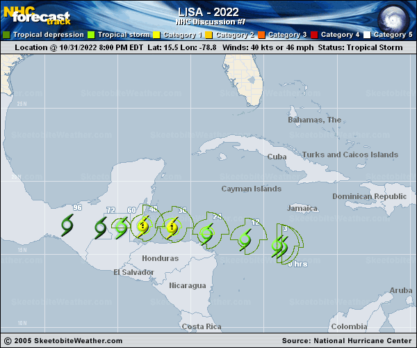 Copy of official data Tropical Storm Lisa Discussion Number 7 NWS National Hurricane Center Miami FL AL152022 500 AM EDT Tue Nov 01 2022 Deep convection associated with Lisa has continued to expand overnight, and there has also been some increase in banding noted in infrared satellite imagery. However, data from an earlier Air Force Reserve reconnaissance aircraft suggest that this has not yet resulted in an increase in intensity. The plane found flight-level and SFMR winds to support an initial intensity of 40 kt, and that is the basis for the advisory intensity. Another Air Force Reserve Hurricane Hunter aircraft is currently en route to investigate the cyclone this morning. Lisa appears poised to strengthen given the recent increase in organization and expected favorable environmental conditions. The storm will be traversing SSTs of around 29 degrees Celsius and remain within an area of low to moderate vertical wind shear. As a result, the NHC intensity forecast calls for steady strengthening, and shows Lisa becoming a hurricane in 24 to 36 hours when it is near the Bay Islands of Honduras. The NHC wind speed forecast follows the ICON and HFIP corrected consensus aids, which is between the higher regional hurricane models and the lower statistical aids. After landfall, rapid weakening is expected and Lisa is forecast to degenerate to a post-tropical remnant low by 72 hours and dissipate shortly thereafter. The tropical storm is moving just north of due west or 280/12 kt. A strong low- to mid-level ridge located to the north of Lisa should keep the tropical cyclone on a generally westward track during the next couple of days. This motion is expected to bring the core of the cyclone near the Bay Islands of Honduras by early Wednesday, and across the coast of Belize by late Wednesday. The dynamical models remain in relatively good agreement, and the NHC track is near the middle of the guidance envelope. The updated track forecast is slightly north of the previous track at 12 and 24 hours, but is very similar to the earlier official forecast thereafter. Key Messages: 1. Hurricane conditions are possible in the Bay Islands of Honduras early Wednesday and along the coast of Belize by Wednesday afternoon, where a Hurricane Watch is in effect. 2. Tropical storm conditions are expected along portions of the north coast of Honduras, where a Tropical Storm Warning has been issued. A Tropical Storm Watch is in effect for the Caribbean coast of Guatemala, and the southeastern Yucatan Peninsula of Mexico, where tropical storm conditions are possible beginning Wednesday afternoon. 3. Localized flash flooding is expected across portions of the eastern Yucatan Peninsula, Belize and northern Honduras, including the Bay Islands starting late Tuesday through Thursday. 4. There is potential for a dangerous storm surge near where the core of Lisa crosses the coast of Belize. FORECAST POSITIONS AND MAX WINDS INIT 01/0900Z 16.0N 80.5W 40 KT 45 MPH 12H 01/1800Z 16.4N 82.5W 50 KT 60 MPH 24H 02/0600Z 16.7N 84.9W 60 KT 70 MPH 36H 02/1800Z 16.9N 87.0W 70 KT 80 MPH 48H 03/0600Z 17.0N 88.7W 55 KT 65 MPH...INLAND 60H 03/1800Z 17.0N 90.1W 35 KT 40 MPH...INLAND 72H 04/0600Z 17.0N 91.6W 25 KT 30 MPH...POST-TROP/REMNT LOW 96H 05/0600Z...DISSIPATED $$ Forecaster Brown |
