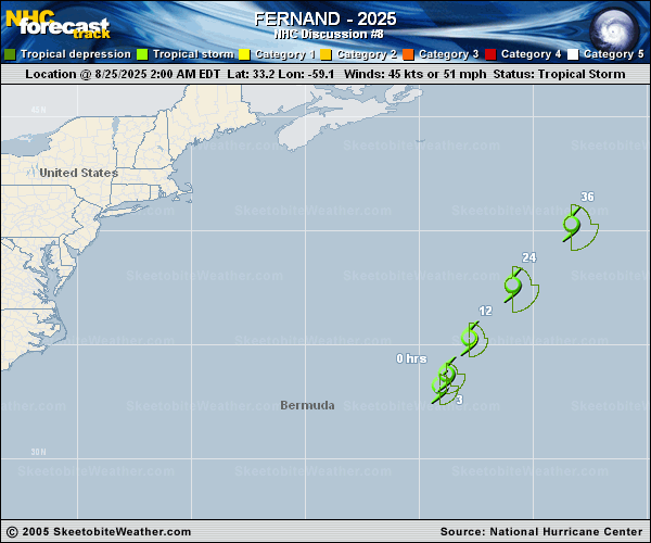 Copy of official data Tropical Storm Fernand Discussion Number 8 NWS National Hurricane Center Miami FL AL062025 1100 AM AST Mon Aug 25 2025 A large burst of persistent convection remains in the southeastern quadrant of Fernand, with 1-minute GOES-19 visible imagery suggesting that the low-level center is positioned on the northwestern edge of the burst. Scatterometer data indicate that the maximum winds have increased to about 50 kt, so that will be the initial intensity. Little change in strength is anticipated today, followed by weakening commencing tomorrow due to Fernand reaching cooler waters with increasing shear. The model envelope is fairly narrow, and the new NHC intensity forecast is quite similar to the previous one and the model consensus. The initial motion is north-northeast or 025/12 kt. A general north-northeastward to northeastward motion is expected with some increase in forward speed during the remainder of the cyclone's life due to steering from the subtropical ridge and a mid-latitude trough. There are some differences on whether Fernand is picked up by the trough, like the GFS solution, or more shunted to the southeast, displayed by the ECMWF/Google Deep Mind solutions. The official forecast is on the eastern side of the guidance envelope, closer to the latter models and the previous NHC forecast. Post-tropical transition is expected on Wednesday due to cold waters, with a fast dissipation by Thursday as the weak cyclone opens up into a trough. FORECAST POSITIONS AND MAX WINDS INIT 25/1500Z 34.2N 57.8W 50 KT 60 MPH 12H 26/0000Z 36.0N 56.7W 50 KT 60 MPH 24H 26/1200Z 38.5N 54.6W 45 KT 50 MPH 36H 27/0000Z 41.5N 51.5W 40 KT 45 MPH 48H 27/1200Z 44.0N 48.0W 35 KT 40 MPH...POST-TROPICAL 60H 28/0000Z...DISSIPATED $$ Forecaster Blake |