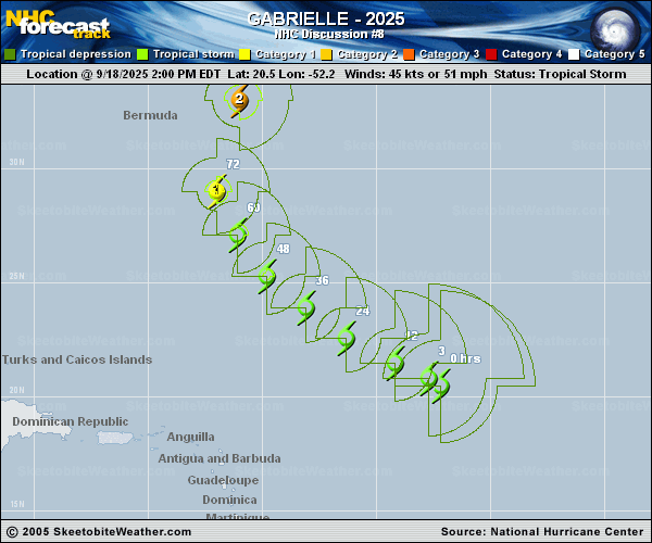 Copy of official data Tropical Storm Gabrielle Discussion Number 8 NWS National Hurricane Center Miami FL AL072025 1100 PM AST Thu Sep 18 2025 Gabrielle has managed to re-develop deep convection near its low-level center this evening. Thunderstorms in the northeast quadrant formed early in the afternoon and have continued into the evening, producing cloud top temperatures colder than -80 degrees C. A scatterometer pass from 0012 UTC measured the eastern portion of the circulation with wind speeds close to 40 kt. However, these data did not capture the radius of maximum wind, which is assumed to have stronger winds. Therefore, the initial intensity is held at 45 kt for this advisory. Global models suggest environmental conditions will be unfavorable for the next day or so while Gabrielle contends with strong-to-moderate vertical wind shear and dry air intrusions. By this weekend, both of these impediments should subside and allow the storm to gradually strengthen. Once again, the intensity aids have risen this cycle. The NHC intensity forecast has been nudged upward and now lies in the middle of the guidance envelope with a peak of 90 kt by day 4. Gabrielle is moving west-northwestward at 10 kt. The storm should slowly turn toward the northwest over the next few days around the periphery of a subtropical ridge centered over the central Atlantic. Late this weekend and into early next week, the storm is expected to turn toward the north and northeast in the flow between the ridge and a frontal system approaching from the west. There are still some speed differences among the numerical models, however the overall track guidance spread is not as significant this cycle. The latest official track forecast is slightly east of the previous prediction and lies between the consensus aids to the west and Google DeepMind to the east. Interests in Bermuda should continue to monitor Gabrielle over the next several days. FORECAST POSITIONS AND MAX WINDS INIT 19/0300Z 21.2N 53.4W 45 KT 50 MPH 12H 19/1200Z 22.0N 54.9W 45 KT 50 MPH 24H 20/0000Z 23.2N 56.8W 45 KT 50 MPH 36H 20/1200Z 24.5N 58.4W 50 KT 60 MPH 48H 21/0000Z 26.1N 59.9W 55 KT 65 MPH 60H 21/1200Z 28.0N 61.0W 60 KT 70 MPH 72H 22/0000Z 29.9N 61.4W 70 KT 80 MPH 96H 23/0000Z 34.6N 58.6W 90 KT 105 MPH 120H 24/0000Z 40.1N 48.6W 80 KT 90 MPH $$ Forecaster Bucci |