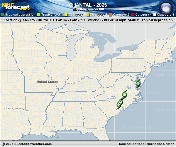 Copy of official data Tropical Depression Chantal Discussion Number 10 NWS Weather Prediction Center College Park MD AL032025 1100 PM EDT Sun Jul 06 2025 Key Messages: 1. Flash flood concerns continue across portions of northern North Carolina Sunday Night and Virginia into Monday. Isolated to scattered flash flooding could occur within more urbanized areas. 2. Life-threatening surf and rip currents conditions are expected to continue at beaches along the U.S. East Coast from northeastern Florida to the Mid-Atlantic states during the next day or so. Beach goers should heed the advice of lifeguards and local officials. FORECAST POSITIONS AND MAX WINDS INIT 07/0300Z 35.9N 78.7W 25 KT 30 MPH...INLAND 12H 07/1200Z 37.2N 77.3W 25 KT 30 MPH...INLAND 24H 08/0000Z 39.2N 74.4W 25 KT 30 MPH...OFFSHORE NEW JERSEY $$ Forecaster Roth |