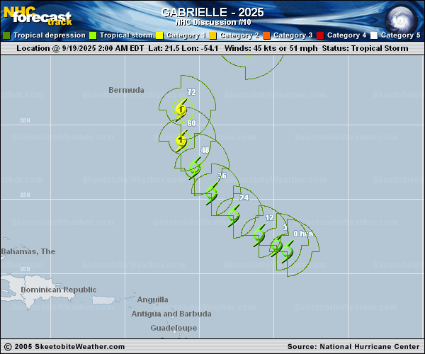 Copy of official data Tropical Storm Gabrielle Discussion Number 10 NWS National Hurricane Center Miami FL AL072025 Issued by the NWS Weather Prediction Center College Park MD 1100 AM AST Fri Sep 19 2025 Gabrielle's low-level center remains mostly exposed, now between a large area of deep convection in the eastern semicircle and growing cells in the southwestern quadrant. There has been little change in the satellite estimates and since scatterometer missed the radius-of-maximum winds this morning, the initial intensity will remain 45 kt. The storm is moving northwestward or 305 degrees at 10 kt, with the subtropical ridge located to its north. A general pattern of troughing is expected to persist near the southeastern U.S. coast and far western Atlantic for the next several days, which is expected cause Gabrielle to recurve around the western periphery of the ridge over the next 4 days. While the track guidance remains relatively tight during this period, the along-track spread (speed differences) are quite large in the medium range. The HCCA and Google DeepMind (GDM) ensemble mean have bifurcated on the latest cycle with the corrected consensus to the north and the GDM to the south. Our forecast has adjusted slightly north, but remains on the southern side of the overall consensus. The reliable track models continue to show Gabrielle's center passing at least 140 n mi east of Bermuda in about 3 days. However, interests on the island should continue to monitor Gabrielle's progress since NHC's average track error at 3 days is about 90 n mi, and hazards can extend well away from the center. There remains a 20-25 percent chance of tropical-storm-force winds occurring on Bermuda. The moderate westerly shear currently affecting Gabrielle is forecast to gradually lessen below 10 kt by 24-36 hours. This should begin to mitigate the effects of surrounding dry air and allow for gradual strengthening. The NHC intensity forecast has once again been raised to trend toward the latest IVCN and HCCA consensus aids, and Gabrielle is expected to become a hurricane by Sunday. By day 5, the onset of significantly stronger shear and cooler waters should induce some weakening. There is significant uncertainty about when Gabrielle might become extratropical, as the forward speed of the system may contribute significantly to a higher peak intensity (longer time over warmer waters). KEY MESSAGES: 1. Gabrielle is forecast to become a hurricane by Sunday and pass east of Bermuda Sunday night and Monday. Interests on Bermuda should monitor Gabrielle's forecasts since it is too soon to specify the magnitude of potential wind and rainfall impacts. 2. Swells generated by Gabrielle are expected to reach Bermuda tonight and build through the weekend. These swells are likely to cause life-threatening surf and rip current conditions. FORECAST POSITIONS AND MAX WINDS INIT 19/1500Z 21.9N 55.6W 45 KT 50 MPH 12H 20/0000Z 22.9N 56.9W 45 KT 50 MPH 24H 20/1200Z 24.3N 58.5W 50 KT 60 MPH 36H 21/0000Z 26.0N 59.8W 55 KT 65 MPH 48H 21/1200Z 27.8N 60.8W 65 KT 75 MPH 60H 22/0000Z 29.8N 61.2W 75 KT 85 MPH 72H 22/1200Z 32.0N 60.9W 85 KT 100 MPH 96H 23/1200Z 37.5N 54.0W 95 KT 110 MPH 120H 24/1200Z 41.3N 40.2W 75 KT 85 MPH $$ Forecaster Churchill/Blake |