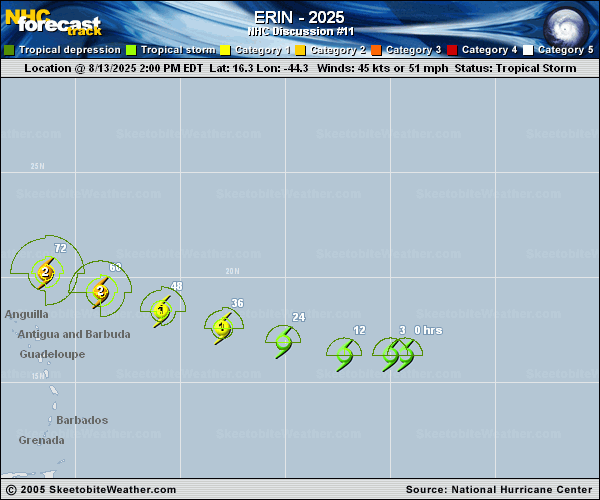Copy of official data Tropical Storm Erin Discussion Number 11 NWS National Hurricane Center Miami FL AL052025 1100 PM AST Wed Aug 13 2025 Satellite images show that a solid area of convection remains near Erin, with low-cloud motions suggesting the center is on the northeastern side of the thunderstorm activity. Overall, there hasn't been a lot of change with the satellite presentation, and that is reflected in recent stable Dvorak and scatterometer values. The initial intensity is held at 45 kt for this advisory. The environment around Erin should remain marginally conducive during the next day or so, which will likely promote gradual strengthening. Thereafter, the storm is forecast to move across warmer waters, with potentially a decrease in shear. This evolution results in a period of potential rapid intensification late this week, and the official forecast reflects that possibility. While shear is generally forecast to increase over the weekend, this appears to be canceled out by large-scale divergence and water temperatures above 29C. Most models respond to this by showing a lower rate of intensification at that time. The new intensity forecast is adjusted upward somewhat from the previous forecast beyond 24 h based on the current guidance. There is increasing confidence on a large and powerful hurricane over the southwestern Atlantic Ocean this weekend. The initial motion is now 270/14 kt. There are no significant changes to the forecast track or steering. Erin should move westward overnight and then west-northwestward from Thursday through the weekend due to steering from the subtropical ridge. The ridge is forecast to break by early next week, resulting in a turn towards the northwest or north-northwest. The new forecast is basically an update of the previous forecast in the near term, and on the eastern side of the guidance envelope by day 5 between the consensus and the Google Deep Mind model. There is still a greater than normal uncertainty about what impacts Erin may bring to portions of the Bahamas, the east coast of the United States, and Bermuda in the long range. KEY MESSAGES: 1. Locally heavy rainfall, high surf and rip currents, and tropical-storm force winds could occur in portions of the northern Leeward Islands, the Virgin Islands, and Puerto Rico this weekend as the core of Erin passes north of those islands. Interests in these areas should continue to monitor the progress of Erin. 2. While there is still uncertainty in what impacts might occur in portions of the Bahamas, the east coast of the United States, and Bermuda next week, the risk of dangerous surf and rip currents across the western Atlantic basin next week is increasing. As we approach the climatological peak of the hurricane season, this is an opportune time to ensure your preparedness plans are in place. FORECAST POSITIONS AND MAX WINDS INIT 14/0300Z 16.3N 46.6W 45 KT 50 MPH 12H 14/1200Z 16.5N 48.8W 50 KT 60 MPH 24H 15/0000Z 17.2N 51.8W 55 KT 65 MPH 36H 15/1200Z 18.0N 54.9W 70 KT 80 MPH 48H 16/0000Z 18.9N 57.8W 85 KT 100 MPH 60H 16/1200Z 19.8N 60.6W 95 KT 110 MPH 72H 17/0000Z 20.6N 62.9W 100 KT 115 MPH 96H 18/0000Z 22.8N 66.6W 105 KT 120 MPH 120H 19/0000Z 25.5N 68.5W 110 KT 125 MPH $$ Forecaster Blake |