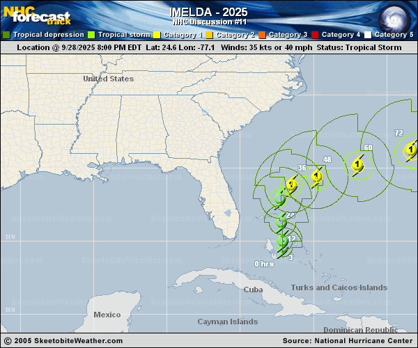 Copy of official data Tropical Storm Imelda Discussion Number 11 NWS National Hurricane Center Miami FL AL092025 500 AM EDT Mon Sep 29 2025 Imelda continues to slowly become better organized. Earlier aircraft data indicated that the pressure has fallen to 996 mb, and satellite imagery shows persistent convection near and north of the center. The initial intensity is set to 40 kt with numerous 35 kt wind vectors on the evening scatterometer pass and higher Dvorak estimates. The storm is progressing northward at about 7 kt. This motion is forecast to continue today due to steering along the western side of the subtropical ridge. Humberto is forecast to erode the ridge by Tuesday, causing an abrupt turn of Imelda to the east-northeast with some acceleration as the cyclone encounters faster mid- latitude flow. There is increasing confidence in the storm staying well offshore of the southeastern United States coast. The latest track guidance is similar to the previous cycle, although faster at the end, and remains close to Bermuda. The medium range forecast beyond Bermuda is quite uncertain with a complicated flow pattern due to a digging north Atlantic trough and then-extratropical Humberto interactions. Imelda is forecast to gradually strengthen within an environment of moderate south-southwesterly vertical wind shear, warm ocean waters and within a fairly moist mid-level air mass for the next couple of days. Thereafter, an upper-level trough will help to initiate extratropical transition, and some of the models are showing this as a favorable trough interaction, causing a larger and stronger cyclone. The GFS and ECMWF models are also showing a sting jet developing as well about the time that Imelda is near Bermuda, so that situation will have to be watched closely. The official forecast remains at the higher end of the model guidance. Most of the global models are showing a faster extratropical transition after Imelda moves past Bermuda, and that is indicated in the new NHC forecast. KEY MESSAGES: 1. Imelda is expected to continue to bring tropical storm conditions to portions of the northwestern Bahamas today. 2. Rainfall associated with Imelda will continue to impact eastern Cuba and the Bahamas through Tuesday, which will likely produce flash and urban flooding. Mudslides are possible in the higher terrain. Heavy rainfall across the coastal Carolinas could cause isolated flash and urban flooding through Tuesday. 3. Interests in Bermuda should monitor the progress of Imelda as a Hurricane Watch could be required late today. 4. Swells and high surf from both Humberto and Imelda are expected to produce dangerous marine conditions and rip currents along the east coast of Florida and the Georgia coast today. These conditions are expected to spread northward along much of the east coast of the United States early this week. FORECAST POSITIONS AND MAX WINDS INIT 29/0900Z 25.5N 77.1W 40 KT 45 MPH 12H 29/1800Z 26.7N 77.1W 50 KT 60 MPH 24H 30/0600Z 28.1N 76.8W 60 KT 70 MPH 36H 30/1800Z 28.9N 75.1W 65 KT 75 MPH 48H 01/0600Z 29.9N 72.3W 70 KT 80 MPH 60H 01/1800Z 31.1N 68.8W 75 KT 85 MPH 72H 02/0600Z 32.4N 63.8W 80 KT 90 MPH 96H 03/0600Z 35.0N 56.0W 70 KT 80 MPH...POST-TROP/EXTRATROP 120H 04/0600Z 39.5N 52.5W 60 KT 70 MPH...POST-TROP/EXTRATROP $$ Forecaster Blake |