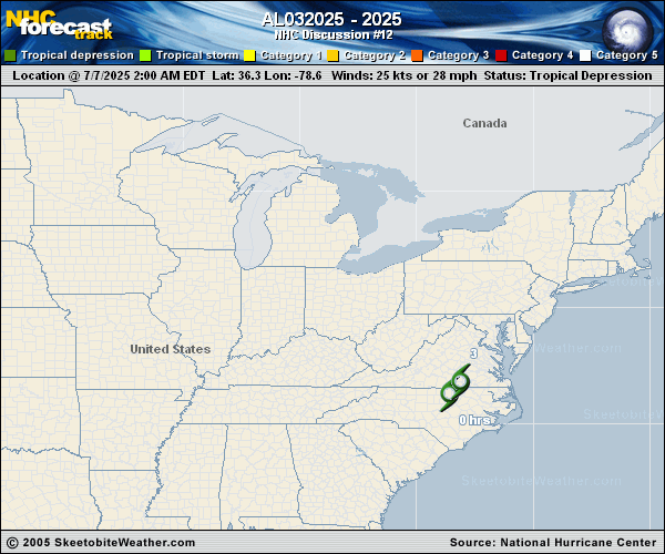 Copy of official data Post-Tropical Cyclone Chantal Discussion Number 12 NWS Weather Prediction Center College Park MD AL032025 1100 AM EDT Mon Jul 07 2025 Key Messages: 1. Heavy rainfall from Post-Tropical Cyclone Chantal will continue to result in flash flood concerns across portions of the Delmarva, New Jersey, and eastern Pennsylvania. Isolated to scattered flash flooding is possible (particularly within more urbanized areas). 2. Life-threatening surf and rip currents conditions are expected to continue at beaches along the U.S. East Coast from northeastern Florida to the Mid-Atlantic states during the next day or so. Beach goers should heed the advice of lifeguards and local officials. FORECAST POSITIONS AND MAX WINDS INIT 07/1500Z 37.5N 76.3W 25 KT 30 MPH...POST-TROPICAL 12H 08/0000Z 39.0N 74.0W 25 KT 30 MPH...POST-TROPICAL 24H 08/1200Z 41.5N 69.3W 25 KT 30 MPH...POST-TROPICAL 36H 09/0000Z...DISSIPATED $$ Forecaster Santorelli/Taylor/Shieh |