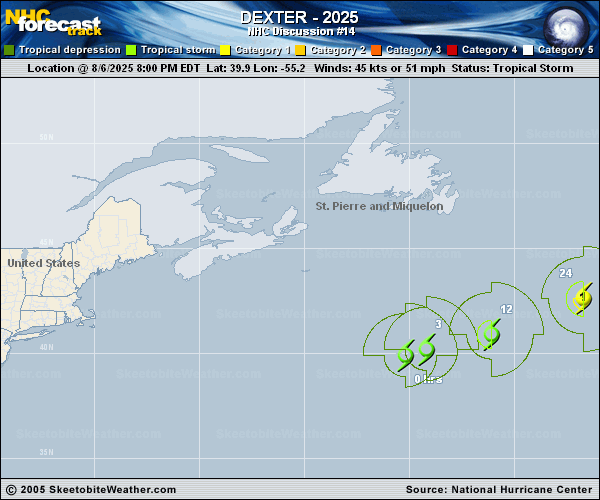 Copy of official data Tropical Storm Dexter Discussion Number 14 NWS National Hurricane Center Miami FL AL042025 500 AM AST Thu Aug 07 2025 Dexter is on the edge of being extratropical. An earlier scatterometer overpass showed what is likely a warm front extending from the east into or near the center. In addition, a cloud band in the southeastern semicircle appears to be a developing cold front. However, a strong convective burst is currently occurring a little east of the center, and based on this Dexter as maintained as a tropical storm at this time. Satellite intensity estimates have changed little since the last advisory, so the initial intensity is held at 45 kt. Dexter should complete extratropical transition during the next 6-12 h as it merges with a mid- to upper-level trough approaching from the northwest. Global model show strengthening due to baroclinic forcing as this happens, and Dexter is forecast to become a hurricane-force extratropical low in about 24 hours. Gradual weakening is expected after that time as the upper-level trough dampens out. The NHC intensity forecast remains above the guidance in the short term, but in line with the bulk of the models from 48 to 96 hours. The cyclone is forecast to weaken to a trough by 120 h. The initial motion is now 070/16. A northeastward motion is expected during the next day or two as Dexter interacts and merges with the aforementioned trough. After that time, a turn back to the east-northeast or east is likely as the cyclone is steered by the mid-latitude westerly flow. The guidance nudged slightly northward between 24-60 h, and the new track forecast has a similar small nudge. It is otherwise similar to the previous forecast and close to the various consensus models. FORECAST POSITIONS AND MAX WINDS INIT 07/0900Z 40.6N 52.1W 45 KT 50 MPH 12H 07/1800Z 41.7N 49.0W 55 KT 65 MPH...POST-TROP/EXTRATROP 24H 08/0600Z 43.4N 45.3W 65 KT 75 MPH...POST-TROP/EXTRATROP 36H 08/1800Z 44.8N 41.2W 60 KT 70 MPH...POST-TROP/EXTRATROP 48H 09/0600Z 45.7N 36.8W 50 KT 60 MPH...POST-TROP/EXTRATROP 60H 09/1800Z 46.3N 32.4W 40 KT 45 MPH...POST-TROP/EXTRATROP 72H 10/0600Z 46.7N 28.5W 35 KT 40 MPH...POST-TROP/EXTRATROP 96H 11/0600Z 47.6N 20.7W 30 KT 35 MPH...POST-TROP/EXTRATROP 120H 12/0600Z...DISSIPATED $$ Forecaster Beven |