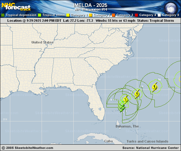 Copy of official data Tropical Storm Imelda Discussion Number 14 NWS National Hurricane Center Miami FL AL092025 1100 PM EDT Mon Sep 29 2025 Satellite imagery and reports from an Air Force Reserve Hurricane Hunter aircraft indicate that Imelda has lost some organization since the last advisory. The aircraft data shows a broad center with a radius of maximum winds of at least 35 n mi, and the satellite imagery currently shows no organized convection near the aircraft-reported center. In addition, satellite fixes from TAFB and SAB were well to the northeast of the aircraft position, suggesting the vortex has a significant vertical tilt. Despite the ragged structure, the aircraft-reported winds support keeping an initial intensity of 55 kt. The initial motion is now 010/7 kt. A turn toward the northeast is expected tonight, followed by a turn toward the east-northeast and a faster forward speed. This change is due partly to Hurricane Humberto eroding the steering influence of a subtropical ridge east of Bermuda, and partly due to a deep-layer trough that is digging southward to the north and northwest of Imelda. The track guidance overall is a bit slower than earlier, and based on this the new forecast track is a little slower than the previous track. The new forecast track indicates that tropical storm conditions are expected to begin on the island of Bermuda in 36-48 h. Imelda is currently in an upper-level wind environment that has moderate shear, but is strongly divergent, and this is forecast to continue for the next 36-48 h. This should allow some strengthening. However, the current state of the storm is not conducive, and thus the new intensity forecast calls for slower strengthening than the previous forecast. In 48-60 h, the shear increases, and interaction with the deep-layer trough will likely start the extratropical transition process. This should be complete by 72 h. While there may be "sting jet" winds during the transition as mentioned in the previous discussion, the guidance is in good agreement that the system should steadily decay after the transition is complete. Overall, the new intensity forecast is a little weaker compared to the previous forecast. KEY MESSAGES: 1. Imelda is expected to intensify into a hurricane Tuesday or Tuesday night with the cyclone approaching Bermuda during the day Wednesday as a hurricane. A Hurricane Watch is in effect for the island of Bermuda due to the expected onset of tropical storm conditions beginning Wednesday afternoon. 2. Locally heavy rainfall across coastal sections of southeast North Carolina could cause isolated flash and urban flooding through tonight. As Imelda passes near Bermuda, 2 to 4 inches G�� 50 to 100 mm G�� of rainfall is expected from Wednesday into Thursday. 3. Swells and high surf from both Humberto and Imelda are expected to produce dangerous marine conditions and rip currents along much of the East Coast of the United States during the next several days. FORECAST POSITIONS AND MAX WINDS INIT 30/0300Z 28.4N 77.2W 55 KT 65 MPH 12H 30/1200Z 29.2N 76.3W 60 KT 70 MPH 24H 01/0000Z 30.1N 74.1W 65 KT 75 MPH 36H 01/1200Z 31.1N 70.7W 75 KT 85 MPH 48H 02/0000Z 32.4N 66.0W 80 KT 90 MPH 60H 02/1200Z 33.8N 60.7W 75 KT 85 MPH 72H 03/0000Z 35.2N 55.7W 65 KT 75 MPH...POST-TROP/EXTRATROP 96H 04/0000Z 39.4N 50.3W 55 KT 65 MPH...POST-TROP/EXTRATROP 120H 05/0000Z 43.1N 46.6W 45 KT 50 MPH...POST-TROP/EXTRATROP $$ Forecaster Beven |