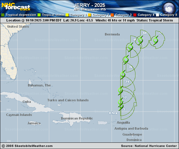 Copy of official data Tropical Storm Jerry Discussion Number 15 NWS National Hurricane Center Miami FL AL102025 1100 PM AST Fri Oct 10 2025 Jerry's low-level circulation remains rather ill-defined especially on the northwest side of the cyclone, where a surface trough extends northwestward from Jerry. The SHIPS guidance is showing about 15-20 kt of northwesterly deep-layer vertical wind shear in Jerry's environment, which is displacing convection to the southeast of the center. Scattered moderate to heavy showers and thunderstorms are still occurring over the Virgin Islands, but the rainband that was producing the persistent heavy rain over the northeastern Caribbean Islands has weakened from earlier and is starting to move away. A recent ASCAT pass shows maximum winds around 50 kt, so the intensity has been raised to 50 kt for this advisory, which is slightly higher than the latest TAFB Dvorak estimate. The tropical-storm-force winds are limited to the eastern semicircle of Jerry. The initial motion estimate is northward, or 350 degrees at 13 kt. This general motion should continue through Saturday night because a north-south-oriented mid-level ridge is currently located to the east of the cyclone. By Sunday night, Jerry should turn eastward as it becomes embedded in the mid-latitude westerlies. Only minor adjustments have been made to the previous NHC track forecast, which generally lies in between the simple and corrected consensus models. Jerry is likely to continue battling moderate to strong shear during the next couple of days, and global model fields (with the exception of the GFS) suggest that the storm will maintain an elongated circulation through this period. Although the shear might decrease a bit after 48 hours, at that point Jerry will be moving over more marginal sea surface temperatures and into a more stable environment. No changes were made to the previous NHC intensity forecast, which is near, or slightly below the middle of the guidance envelope. The global model fields (with the exception of the GFS) show Jerry interacting with a front by Sunday night, and the NHC forecast shows Jerry becoming post-tropical by Monday evening, with dissipation along the front a day or two later. The GFS maintains Jerry as a tropical cyclone through day 5, but that solution is considered an outlier. It should be noted that the circulation of Jerry is quite ill-defined on the northwest side. Therefore, it is possible that Jerry could dissipate at any time this weekend. However, given that most of the global and regional models hold on to the circulation into Sunday, the most likely scenario seems to be that Jerry will stick around for at least another 2 days or so until it begins interacting with the front. KEY MESSAGES: 1. Heavy rainfall from Jerry will lift north of the Leeward Islands, Virgin Islands, and Puerto Rico overnight. As a result, the risk for flash flooding will diminish. 2. Swells generated by Jerry are affecting the Leeward Islands, Windward Islands, the Virgin Islands, Puerto Rico, the Dominican Republic, and the Turks and Caicos Islands and are likely to cause life-threatening surf and rip current conditions. These swells are expected to spread toward the Bahamas by Saturday. FORECAST POSITIONS AND MAX WINDS INIT 11/0300Z 22.7N 63.9W 50 KT 60 MPH 12H 11/1200Z 24.6N 63.3W 50 KT 60 MPH 24H 12/0000Z 27.4N 62.7W 50 KT 60 MPH 36H 12/1200Z 29.6N 62.0W 45 KT 50 MPH 48H 13/0000Z 31.3N 60.8W 45 KT 50 MPH 60H 13/1200Z 32.0N 58.9W 45 KT 50 MPH 72H 14/0000Z 31.4N 56.4W 45 KT 50 MPH...POST-TROPICAL 96H 15/0000Z 29.8N 51.6W 50 KT 60 MPH...POST-TROP/EXTRATROP 120H 16/0000Z...DISSIPATED $$ Forecaster Hagen |