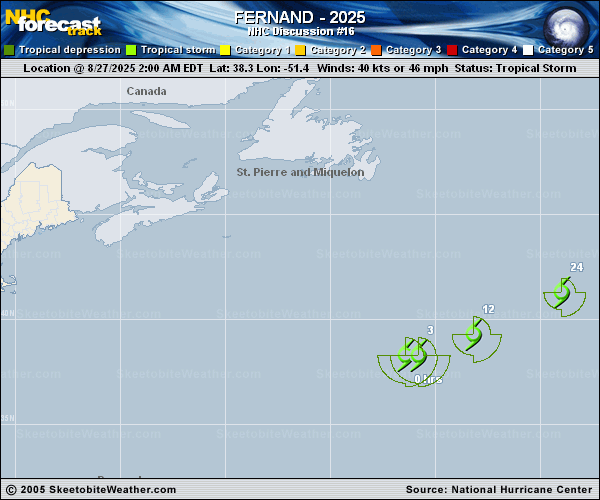 Copy of official data Tropical Storm Fernand Discussion Number 16 NWS National Hurricane Center Miami FL AL062025 1100 AM AST Wed Aug 27 2025 Fernand's center is exposed to the west of a remaining band of deep convection, with the circulation itself a bit elongated. Satellite intensity estimates still encompass a rather large range--from 30 kt to about 45 kt. The initial intensity is held at 40 kt, pending an ASCAT pass which we may not receive until after this advisory is released. Since last evening, convection appears to have had a stronger influence on Fernand's motion compared to the prevailing steering flow. The 12-hour average motion has been eastward, or 085 degrees at 10 kt. Assuming the convective influences lessen, the track models insist that Fernand should resume an acceleration toward the east-northeast very soon, with that motion continuing for the next day or two. Fernand is currently over sea surface temperatures of about 25 degrees Celsius, but it is expected to move over the north wall of the Gulf Stream later today, with SSTs falling to 23-24 degrees Celsius by this evening. These cooler waters should cause Fernand's deep convection to gradually decay through the remainder of the day, and the cyclone could become post-tropical as early as tonight. Winds are likely to remain at gale force, largely due to the system's increasing forward speed. Dissipation--when the circulation opens up into a trough--is likely in 36-48 hours. FORECAST POSITIONS AND MAX WINDS INIT 27/1500Z 38.4N 49.5W 40 KT 45 MPH 12H 28/0000Z 39.7N 46.8W 40 KT 45 MPH 24H 28/1200Z 41.6N 41.9W 35 KT 40 MPH...POST-TROPICAL 36H 29/0000Z 43.6N 35.5W 35 KT 40 MPH...POST-TROPICAL 48H 29/1200Z...DISSIPATED $$ Forecaster Berg |