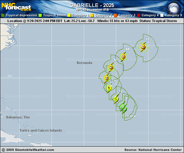 Copy of official data Tropical Storm Gabrielle Discussion Number 16 NWS National Hurricane Center Miami FL AL072025 1100 PM AST Sat Sep 20 2025 Recent GMI and SSMIS passive microwave images of Gabrielle suggest the tight inner core noted in earlier aircraft data has collapsed. A larger mid-level eye structure now wraps over halfway around the circulation but is open to the southwest. The low-level center of the storm lies near the sharp western edge of the convective cloud mass, which suggests Gabrielle is still contending with some shear. Convective band wraps around the eastern side of the storm, where recent ASCAT-B data confirm the strongest surface winds are occurring. The initial intensity is set at 55 kt based on TAFB Dvorak and UW-CIMSS objective satellite intensity estimates. Air Force Reserve Hurricane Hunters are scheduled to investigate the storm tomorrow morning. Gabrielle is moving north-northwestward (335/8 kt) along the southwestern side of a subtropical ridge over the central Atlantic. Over the next couple of days, Gabrielle is expected to recurve to the north and northeast between this ridge and a mid-latitude trough over the eastern United States. The track models remain in good near-term agreement, and the updated NHC track forecast keeps Gabrielle well east of Bermuda on Monday. Then, Gabrielle is forecast to accelerate east-northeastward through the rest of the week while embedded in zonal westerly flow. There are greater speed differences in the track models during the latter half of the forecast period, but the consensus has trended slower once again, and this is reflected in the updated NHC forecast. Assuming Gabrielle is able to solidify its inner core soon, some strengthening is expected over warm waters within a low to moderate shear environment during the next couple of days. The latest track guidance is not quite as aggressive as earlier today. The NHC forecast is very similar to the previous one, remaining close to the HFIP corrected consensus (HCCA) near the higher end of the guidance envelope. By Tuesday, increased westerly shear is forecast to cause Gabrielle to weaken, especially while it moves over cooler waters later next week. The long-range forecast track uncertainty makes it difficult to assess whether Gabrielle will fully complete extratropical transition by the end of the period. However, it seems likely that the system will be losing tropical characteristics and in close proximity to fronts by Friday. KEY MESSAGES: 1. Gabrielle is forecast to become a hurricane on Sunday and pass east of Bermuda on Monday. While the chances of impacts are decreasing, interests on Bermuda should continue to monitor forecast updates since some wind and rainfall impacts are still possible. 2. Swells generated by Gabrielle will continue to affect Bermuda through early next week. These swells are expected to reach the coast of the United States from North Carolina northward, along with the coast of Atlantic Canada, on Sunday and continue through early next week. These swells are likely to cause life-threatening surf and rip current conditions. FORECAST POSITIONS AND MAX WINDS INIT 21/0300Z 26.3N 59.2W 55 KT 65 MPH 12H 21/1200Z 27.4N 60.3W 65 KT 75 MPH 24H 22/0000Z 29.1N 61.3W 75 KT 85 MPH 36H 22/1200Z 30.7N 61.5W 85 KT 100 MPH 48H 23/0000Z 32.3N 60.5W 90 KT 105 MPH 60H 23/1200Z 33.8N 58.2W 85 KT 100 MPH 72H 24/0000Z 35.1N 54.5W 80 KT 90 MPH 96H 25/0000Z 36.5N 44.0W 65 KT 75 MPH 120H 26/0000Z 39.0N 31.5W 60 KT 70 MPH $$ Forecaster Reinhart |