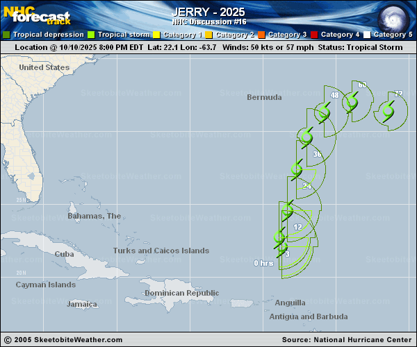 Copy of official data Tropical Storm Jerry Discussion Number 16 NWS National Hurricane Center Miami FL AL102025 500 AM AST Sat Oct 11 2025 Jerry has become slightly better organized this morning. Recent satellite images and AMSR2 passive microwave data show that new deep convection has developed closer to the estimated center position of the storm, with some evidence of curved banding noted in the 89 GHz channel. Based on these developments, the initial intensity is held at 50 kt, which is consistent with the scatterometer data from last night. The wind field remains asymmetric, with tropical-storm-force winds confined to the eastern semicircle of the storm. The estimated initial motion of Jerry is north (005 deg) at 14 kt. A general northward to north-northeastward motion is forecast through the weekend as the storm moves along the western periphery of a subtropical ridge. As this feature becomes reoriented to the south of Jerry early next week, the system is forecast to turn eastward as it interacts with a front and moves within the mid-latitude westerlies. The updated NHC forecast trends toward a simple consensus of the global models and was generally adjusted to the left of the previous prediction. There are some indications in satellite imagery that the center of Jerry may still be elongated. Even if the storm is able to maintain a well-defined circulation over the next couple of days, there is little to suggest that Jerry will strengthen. As the storm moves northward, it will remain in a moderate shear environment and eventually move over marginal SSTs. Because of this, the NHC forecast shows gradual weakening through early next week. While Jerry appears likely to merge with a frontal system to its north and become extratropical at some point during the forecast period, there are differences among the global models as to when this will occur. The GFS remains an outlier, and so the NHC prediction favors the earlier frontal interaction shown by the ECMWF and Canadian models. Alternatively, the cyclone could become stretched out and absorbed along the front even sooner than forecast. KEY MESSAGES: 1. Swells generated by Jerry are affecting the Leeward Islands, Windward Islands, Virgin Islands, Puerto Rico, Dominican Republic, and the Turks and Caicos Islands, and are likely to cause life-threatening surf and rip current conditions. These swells are expected to spread toward the Bahamas today. FORECAST POSITIONS AND MAX WINDS INIT 11/0900Z 24.5N 63.4W 50 KT 60 MPH 12H 11/1800Z 26.4N 63.2W 45 KT 50 MPH 24H 12/0600Z 29.0N 62.6W 45 KT 50 MPH 36H 12/1800Z 31.1N 61.9W 40 KT 45 MPH 48H 13/0600Z 33.0N 60.6W 40 KT 45 MPH 60H 13/1800Z 33.2N 58.5W 40 KT 45 MPH...POST-TROP/EXTRATROP 72H 14/0600Z 32.5N 56.0W 35 KT 40 MPH...POST-TROP/EXTRATROP 96H 15/0600Z...DISSIPATED $$ Forecaster Reinhart |