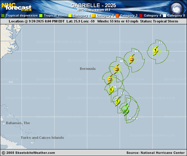 Copy of official data Tropical Storm Gabrielle Discussion Number 17 NWS National Hurricane Center Miami FL AL072025 500 AM AST Sun Sep 21 2025 Gabrielle has become slightly better organized overnight. The large convective band over the eastern side of the system has persisted, and within the last few hours deep convection has been bursting over the low-level center. There have been no microwave passes since the previous advisory, to determine if the inner core has been able to close off on the southwestern side. Satellite intensity estimates from TAFB and SAB were both T/3.5 or 55 kts. Latest objective AiDT, DPRINT, and DMINT intensity estimates from UW-CIMSS range from 52 to 58 kt. Using these estimates, the intensity is held at 55 kt for this advisory, although that could be conservative given recent convective burst. An Air Force Reserve Hurricane Hunter aircraft is en route to investigate the storm and will provide important details on the intensity and structure of the system. The storm is moving north-northwestward at an estimated motion of 335/8 kt. The system continues to be steered by a subtropical ridge over the Central Atlantic. Over the next few days, Gabrielle will begin to recurve to the north and eventually northeast between the western periphery of the ridge and a trough moving offshore the east coast of the United States. Track models remain tightly clustered and keep Gabrielle well east of Bermuda on Monday. As Gabrielle becomes steered within the west-southwesterly wind flow, the system will accelerate across the Atlantic. By day 3 of the forecast period, there is some along track model spread with differences in the forward speed of the system. The NHC track forecast is near the previous in the short term, but some minor adjustments to slow down the previous forecast towards the consensus aids were made between day 3-5. The environment surrounding the system is favorable for strengthening over the next couple of days, with light to moderate wind shear, warm sea surface temperatures, and slightly better mid-level relative humidity values. As Gabrielle looks to be establishing an inner core, it should begin to strengthen. The NHC intensity forecast follows these trends although the intensity guidance has continued to trend not as aggressive due to how long the system has taken to establish an inner core, and the peak intensity forecast has been lowered to 85 kt, which remains near the higher end of the guidance envelope. In about 48 h, westerly shear will begin to increase and sea surface temperatures will begin to cool along the forecast track, thus a weakening trend is forecast. The long-range forecast along track uncertainty makes it difficult to assess whether Gabrielle will fully complete extratropical transition by the end of the period. KEY MESSAGES: 1. Gabrielle is forecast to become a hurricane later today and pass east of Bermuda on Monday. While the chances of impacts are decreasing, interests on Bermuda should continue to monitor forecast updates since some wind and rainfall impacts are still possible. 2. Swells generated by Gabrielle will continue to affect Bermuda during the next few days. These swells are expected to reach the east coast of the United States from North Carolina northward, as well as Atlantic Canada, beginning later today and continuing through early this week. These swells are likely to cause life-threatening surf and rip current conditions. Please consult products from your local weather office. FORECAST POSITIONS AND MAX WINDS INIT 21/0900Z 27.2N 60.0W 55 KT 65 MPH 12H 21/1800Z 28.3N 60.9W 65 KT 75 MPH 24H 22/0600Z 29.9N 61.6W 75 KT 85 MPH 36H 22/1800Z 31.5N 61.3W 80 KT 90 MPH 48H 23/0600Z 33.1N 59.7W 85 KT 100 MPH 60H 23/1800Z 34.5N 56.8W 80 KT 90 MPH 72H 24/0600Z 35.4N 52.9W 70 KT 80 MPH 96H 25/0600Z 36.9N 41.7W 60 KT 70 MPH 120H 26/0600Z 40.0N 29.0W 55 KT 65 MPH $$ Forecaster Kelly |