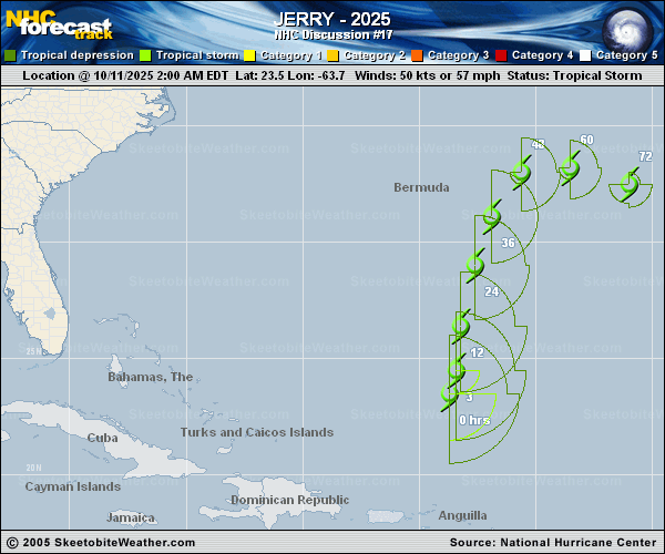 Copy of official data Tropical Storm Jerry Discussion Number 17 NWS National Hurricane Center Miami FL AL102025 1100 AM AST Sat Oct 11 2025 There are strong indications this morning that Jerry may no longer have a well-defined center of circulation. Although there is obvious mid-level rotation in a small area of deep convection, low cloud lines in visible satellite imagery suggest the system may have degenerated into a surface trough of low pressure, which is echoed by global model fields. We will continue advisories at the moment, pending some ASCAT data which should provide some additional clarity on the system's structure. Advisories could be discontinued at any time if new data shows that Jerry has opened up into a trough. Satellite intensity estimates are no higher than about 45 kt, so the current intensity is reduced to that value. The European, UKMET, and Canadian models show Jerry's circulation remaining stretched out and weakening while beginning to merge with a frontal boundary located to its north near 30N in about 24 hours. Even the GFS, which keeps Jerry separate from the frontal boundary, shows the peak winds decreasing. The new NHC forecast now shows Jerry becoming post-tropical by 48 hours and dissipating 72 hours, but both of these transitions could occur much earlier. Although the center is not well defined, the entire system is moving northward (005 degrees) at 14 kt. A turn toward the northeast is expected on Sunday, followed by an eastward motion on Monday as Jerry merges with a front and becomes embedded in mid-latitude westerly flow. The new track forecast is generally just an update of the previous prediction. FORECAST POSITIONS AND MAX WINDS INIT 11/1500Z 25.8N 63.2W 45 KT 50 MPH 12H 12/0000Z 28.0N 62.8W 45 KT 50 MPH 24H 12/1200Z 30.3N 62.0W 40 KT 45 MPH 36H 13/0000Z 32.0N 60.8W 35 KT 40 MPH 48H 13/1200Z 32.6N 59.0W 35 KT 40 MPH...POST-TROPICAL 60H 14/0000Z 32.0N 56.6W 35 KT 40 MPH...POST-TROP/EXTRATROP 72H 14/1200Z...DISSIPATED $$ Forecaster Berg |