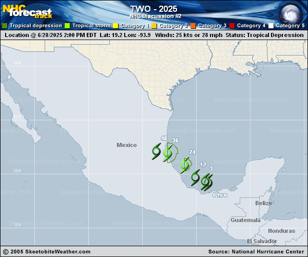 Copy of official data Tropical Depression Two Discussion Number 2 NWS National Hurricane Center Miami FL AL022025 1000 PM CDT Sat Jun 28 2025 Tropical Depression Two is poorly organized at this time. During the latter part of the Hurricane Hunter Mission this afternoon, the aircraft was unable to close off the circulation. Since that time, conventional satellite imagery and 2235 UTC SSM/IS overpass show little change in organization, although surface observations suggest the circulation is still closed. The initial intensity is held at 25 kt in agreement with current satellite intensity estimates. The initial motion is a somewhat uncertain 295/7. The subtropical ridge to the east and northeast of the cyclone should steer the system generally west-northwestward for the next couple of days, bringing the center to the eastern coast of Mexico near the 24 h point. There is little change in either the track guidance or the track forecast since the last advisory. It should be noted that some erratic motion could occur as the circulation interacts with the coast of Mexico. The cyclone is experiencing 20-25 kt of southwesterly vertical shear. However, the upper-level winds are divergent, which should allow the system to produce significant convection. It is expected that this convection will lead to a little strengthening despite the shear, and based on this the depression is forecast to become a tropical storm near the time of landfall. After landfall, the cyclone is expected to rapidly weaken over eastern Mexico. Given the forecast for the depression to become a tropical storm before landfall, a Tropical Storm Warning is in effect for a portion of their eastern Gulf coastline of Mexico. Key Messages: 1. Tropical storm conditions are expected on Sunday for portions of the Gulf coast of Mexico where a Tropical Storm Warning is in effect. 2. Tropical Depression Two will produce heavy rainfall across portions of northeastern Mexico. Life-threatening flooding and mudslides, especially in areas of steep terrain, are possible. FORECAST POSITIONS AND MAX WINDS INIT 29/0300Z 19.7N 95.1W 25 KT 30 MPH 12H 29/1200Z 20.3N 96.0W 30 KT 35 MPH 24H 30/0000Z 21.3N 97.3W 35 KT 40 MPH 36H 30/1200Z 22.1N 98.8W 25 KT 30 MPH...INLAND 48H 01/0000Z...DISSIPATED $$ Forecaster Beven |