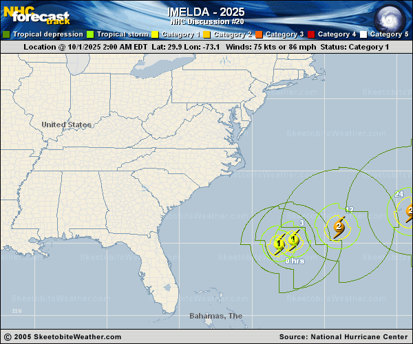 Copy of official data Hurricane Imelda Discussion Number 20 NWS National Hurricane Center Miami FL AL092025 1100 AM EDT Wed Oct 01 2025 The Air Force Hurricane Hunters investigating Imelda this morning have found that the hurricane is strengthening. They reported a closed, circular eyewall during their two passes through the storm, and dropsonde data indicate the central pressure has fallen to around 966 mb. The aircraft measured peak 700-mb flight-level winds of 97 kt in the southeastern quadrant of Imelda, which supports raising the initial intensity to 85 kt for this advisory. Imelda is moving quickly east-northeastward (065/17 kt) within the flow ahead of a western Atlantic deep-layer trough. In the near term, the track models agree that the core of Imelda will move near or over Bermuda tonight into early Thursday, with conditions there expected to deteriorate later today. Once Imelda passes Bermuda and becomes extratropical, the forecast becomes much more uncertain given the significant spread in the track guidance and ensembles. In general, most global models show the extratropical low becoming captured by the upper trough, which results in a northeastward motion across the north Atlantic through the 5-day period. The outlying GFS solution shows the trough missing the low, and as a result the GFS is almost 1500 miles away from the ECMWF at day 5. Once again, the long-range NHC forecast is weighted more heavily toward a consensus of the ECMWF and Google Deep Mind solutions. The improved inner core structure of the hurricane and the potential for positive trough interaction could support some additional strengthening before Imelda reaches Bermuda, despite increasing southwesterly shear expected over the hurricane. This is reflected in the updated NHC intensity forecast, which lies on the high end of the guidance envelope. Extratropical transition is now forecast in 24 h, after which some gradual weakening is predicted. However, Imelda will remain a powerful extratropical cyclone for much of the forecast period as its wind field expands while the cyclone moves deeper into the mid-latitudes. As a result, large swell and dangerous marine and rip current conditions will continue to affect much of the central and western Atlantic for the next several days. KEY MESSAGES: 1. Imelda is expected to bring damaging hurricane-force winds and large and damaging waves to Bermuda when it passes near or over the island tonight. Preparations to protect life and property should be rushed to completion, as tropical storm conditions are expected to spread across the region beginning later today. 2. Heavy rainfall could cause flash flooding across Bermuda later today into Thursday. 3. Swells and high surf from Imelda are expected to produce dangerous marine conditions and rip currents along much of the East Coast of the United States during the next several days. FORECAST POSITIONS AND MAX WINDS INIT 01/1500Z 31.0N 70.4W 85 KT 100 MPH 12H 02/0000Z 31.9N 66.7W 90 KT 105 MPH 24H 02/1200Z 32.6N 61.5W 85 KT 100 MPH...POST-TROP/EXTRATROP 36H 03/0000Z 33.8N 56.2W 75 KT 85 MPH...POST-TROP/EXTRATROP 48H 03/1200Z 35.8N 52.4W 65 KT 75 MPH...POST-TROP/EXTRATROP 60H 04/0000Z 38.0N 50.0W 60 KT 70 MPH...POST-TROP/EXTRATROP 72H 04/1200Z 40.7N 48.2W 55 KT 65 MPH...POST-TROP/EXTRATROP 96H 05/1200Z 45.9N 40.4W 50 KT 60 MPH...POST-TROP/EXTRATROP 120H 06/1200Z 50.0N 32.0W 45 KT 50 MPH...POST-TROP/EXTRATROP $$ Forecaster Reinhart |