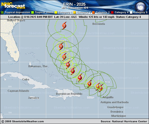 Copy of official data Hurricane Erin Discussion Number 24 NWS National Hurricane Center Miami FL AL052025 500 AM AST Sun Aug 17 2025 Satellite and Doppler Radar data from San Juan indicate that Erin is going through some notable structural changes. The hurricane still has a small eye in radar images with a tight and closed eyewall. Beyond the small core, there are numerous convective rainbands that are expanding in all quadrants, with some indication of an outer eyewall beginning to take shape. Data from the Air Force Hurricane Hunters a few hours ago indicated that the peak winds have been decreasing, and the initial intensity is set at 110 kt using a blend of the latest satellite estimates. The outer bands to the south of the center are still affecting portions of the Virgin Islands, Puerto Rico, and the Dominican Republic. These bands are producing gusty winds and locally heavy rains. The Air Force and NOAA Hurricane Hunters are scheduled to investigate Erin again later this morning, and their data will provide a better assessment of the hurricane's intensity and structure. Erin has been wobbling around, but it appears to be moving a little to the south of the previous track. The hurricane is still moving west-northwestward at 12 kt on the south side of a subtropical ridge. This ridge is expected to break down later today due to a series of troughs moving across the northwestern Atlantic. In response to the pattern change, Erin should gradually turn toward the north and eventually the northeast. This motion should take the core of Erin to the east of the Bahamas on Monday and then roughly midway between Bermuda and the east coast of the U.S. around the middle of the week. The NHC track forecast has been nudged to the west in the short term based on the initial motion and latest model guidance. The quick weakening over the past 6 to 12 hours is associated with Erin's structural changes and not environmental conditions. Since the large-scale environment is expected to be favorable for about another day, re-strengthening is possible during that time period. However, it should be noted that predicting the intensity evolution from internal dynamics are challenging, and models often provide little reliability in their solutions. Beyond 24 to 36 hours, a broadening of the wind field and some increase in shear should cause a gradual decay in the peak winds. Regardless of the details, there is high confidence that Erin will remain a powerful hurricane during the next several days. Erin is growing in size, and that trend is expected to continue over the next few days. The expanding wind field will result in rough ocean conditions over much of the western Atlantic. Given the track adjustments and increasing size, the government of the Bahamas has issued a Tropical Storm Warning for the Turks and Caicos Islands and a Tropical Storm Watch for the Southeast Bahamas. KEY MESSAGES: 1. Heavy rainfall is expected to continue across the Virgin Islands and Puerto Rico today. Locally considerable flash and urban flooding, along with landslides or mudslides, are possible. 2. Tropical storm conditions are expected in the Turks and Caicos Islands and are possible in the Southeast Bahamas tonight and Monday. Gusts to tropical storm force are possible in Erin's outer rainbands in portions of Puerto Rico today and the central Bahamas on Monday and Tuesday. 3. Erin is expected to produce life-threatening surf and rip currents along the beaches of the Bahamas, much of the east coast of the U.S., Bermuda, and Atlantic Canada during the next several days. 4. Interests along the North Carolina and Mid-Atlantic coasts, and Bermuda should monitor the progress of Erin as there is a risk of strong winds associated with the outer rainbands during the middle part of the week. FORECAST POSITIONS AND MAX WINDS INIT 17/0900Z 20.6N 66.4W 110 KT 125 MPH 12H 17/1800Z 21.3N 67.9W 115 KT 130 MPH 24H 18/0600Z 22.5N 69.5W 125 KT 145 MPH 36H 18/1800Z 23.8N 70.6W 120 KT 140 MPH 48H 19/0600Z 25.2N 71.5W 115 KT 130 MPH 60H 19/1800Z 26.9N 72.1W 110 KT 125 MPH 72H 20/0600Z 28.9N 72.2W 105 KT 120 MPH 96H 21/0600Z 33.3N 70.2W 95 KT 110 MPH 120H 22/0600Z 38.6N 63.2W 85 KT 100 MPH $$ Forecaster Cangialosi |
