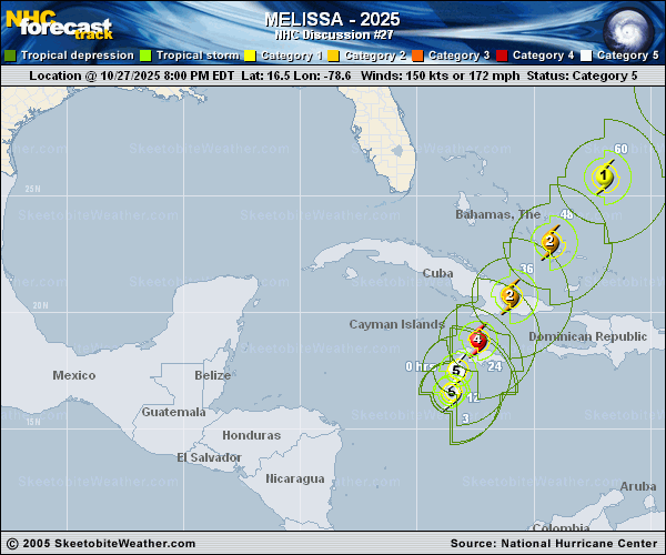 Copy of official data Hurricane Melissa Discussion Number 27 NWS National Hurricane Center Miami FL AL132025 1100 PM EDT Mon Oct 27 2025 Both Air Force and NOAA Hurricane Hunter aircraft have been investigating Melissa this evening. They found that the system is maintaining category 5 intensity with the central pressure near 903 mb and peak 700 mb flight-level and tail Doppler radar winds supporting 150 kt for the current intensity. The hurricane continues to exhibit a well-defined eye about 10 n mi in diameter embedded within extremely cold cloud tops to near -90 deg C. Upper-level outflow remains well defined over the system. Although such intense tropical cyclones typically undergo an eyewall replacement, radar observations from Jamaica do not show this occurring thus far. After remaining nearly stationary over the past few hours, Melissa now appears to be moving slowly north-northeastward with an initial motion estimate of around 020/02 kt. During the next few days, a mid-tropospheric trough is forecast to deepen near the southeastern U.S. coast. This should result in Melissa moving north-northeastward to northeastward with increasing forward speed through the forecast period. The official forecast is similar to the previous one and also close the tightly-clustered consensus and Google DeepMind guidance. The only significant difference in the track forecast compared to earlier today is a slower motion during the first couple of days, which delays the expected arrival of the core of Melissa over Jamaica, eastern Cuba, and the southeastern or Central Bahamas. Some fluctuations in intensity could still occur during the short period before Melissa reaches Jamaica. The primary influence on the hurricane's intensity during the next 36 hours will be the interaction with land. Some weakening is anticipated after the system moves over Jamaica and eastern Cuba. More substantial weakening is likely after the system moves past Cuba and over the southwestern Atlantic, where the vertical wind shear is likely to increase significantly. The official intensity forecast is close to the latest LGEM guidance. Key Messages: 1. Jamaica: Remain in your safe shelter. Catastrophic flash flooding and numerous landslides are expected through Tuesday. The eyewallG��s destructive winds may cause total structural failure, particularly in higher elevations, leading to widespread infrastructural damage, prolonged power and communication outages, and isolated communities. Along the southern coast, life-threatening storm surge and damaging waves are anticipated through Tuesday. Failure to take immediate action may result in serious injury or significant loss of life. 2. Haiti and the Dominican Republic: Catastrophic flash flooding and landslides are expected across southwestern Haiti and southern portions of the Dominican Republic through midweek. In Haiti, extensive infrastructural damage and isolation of communities is likely. Tropical storm conditions are expected late Tuesday and Wednesday. 3. Eastern Cuba: Heavy rainfall with life-threatening flash flooding and landslides is expected to begin shortly. Life-threatening storm surge and damaging winds are expected late Tuesday and Tuesday night. Preparations should be rushed to completion. 4. Southeast and Central Bahamas and the Turks and Caicos: Hurricane conditions, life-threatening storm surge, and heavy rainfall are expected across portions of the southeast and central Bahamas on Wednesday. Residents should follow advice given by local officials and be sure to have preparations complete by Tuesday night. Tropical storm conditions, heavy rains, and a significant storm surge is expected in the Turks and Caicos Islands on Wednesday. FORECAST POSITIONS AND MAX WINDS INIT 28/0300Z 16.6N 78.5W 150 KT 175 MPH 12H 28/1200Z 17.5N 78.3W 150 KT 175 MPH 24H 29/0000Z 18.8N 77.4W 120 KT 140 MPH 36H 29/1200Z 20.7N 76.0W 90 KT 105 MPH...INLAND 48H 30/0000Z 23.0N 74.3W 85 KT 100 MPH...OVER WATER 60H 30/1200Z 25.8N 72.0W 80 KT 90 MPH 72H 31/0000Z 29.8N 68.2W 75 KT 85 MPH 96H 01/0000Z 38.9N 56.5W 60 KT 70 MPH 120H 02/0000Z 47.5N 40.0W 50 KT 60 MPH...POST-TROP/EXTRATROP $$ Forecaster Pasch |